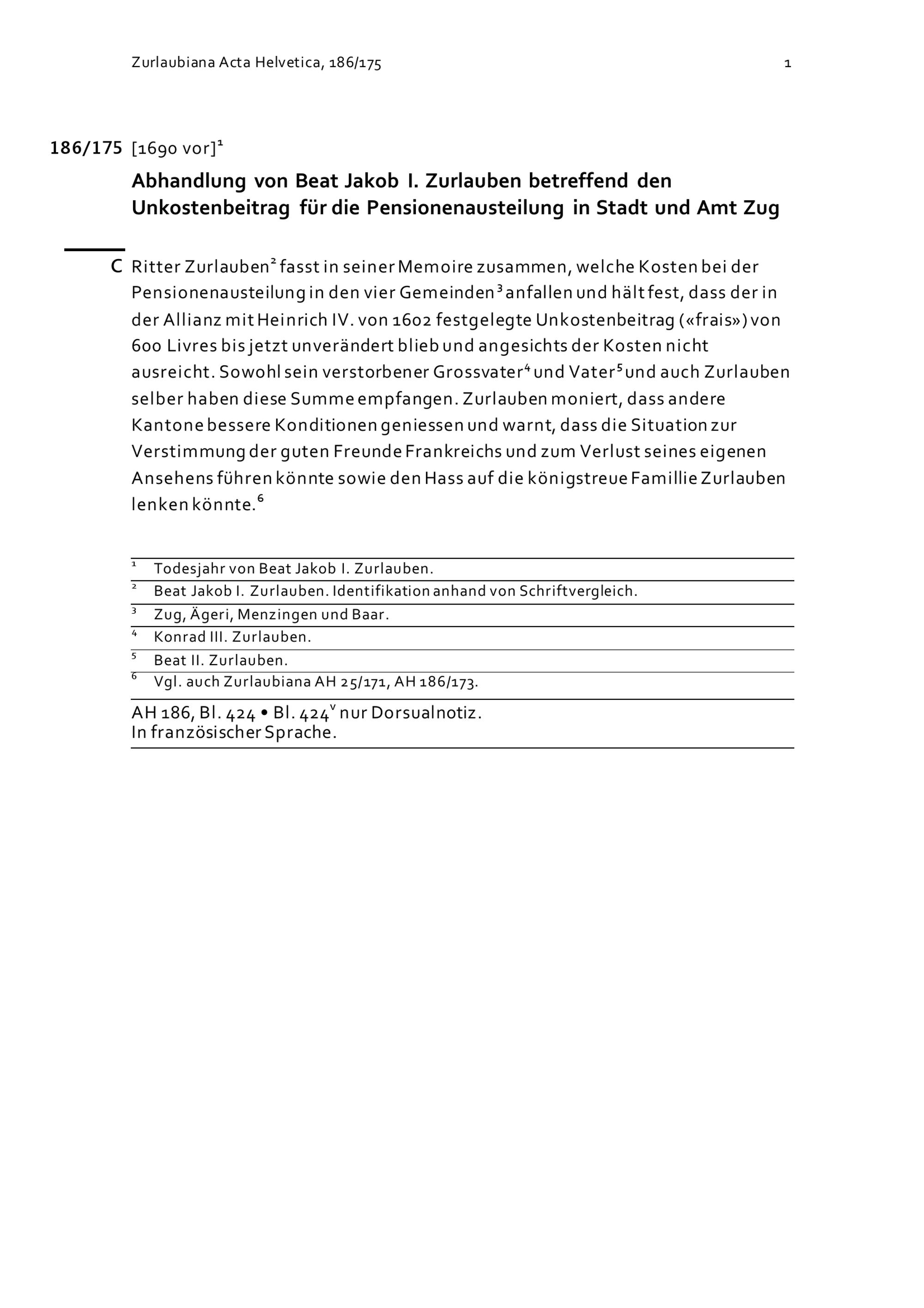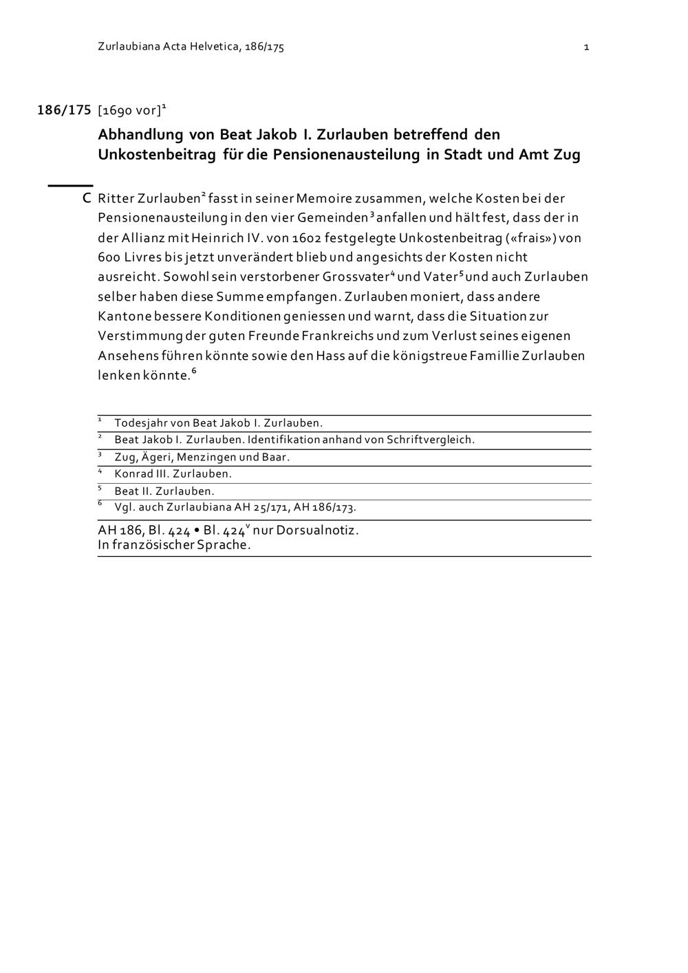 Abhandlung von Beat Jakob I. Zurlauben betreffend den Unkostenbeitrag für die Pensionenausteilung...