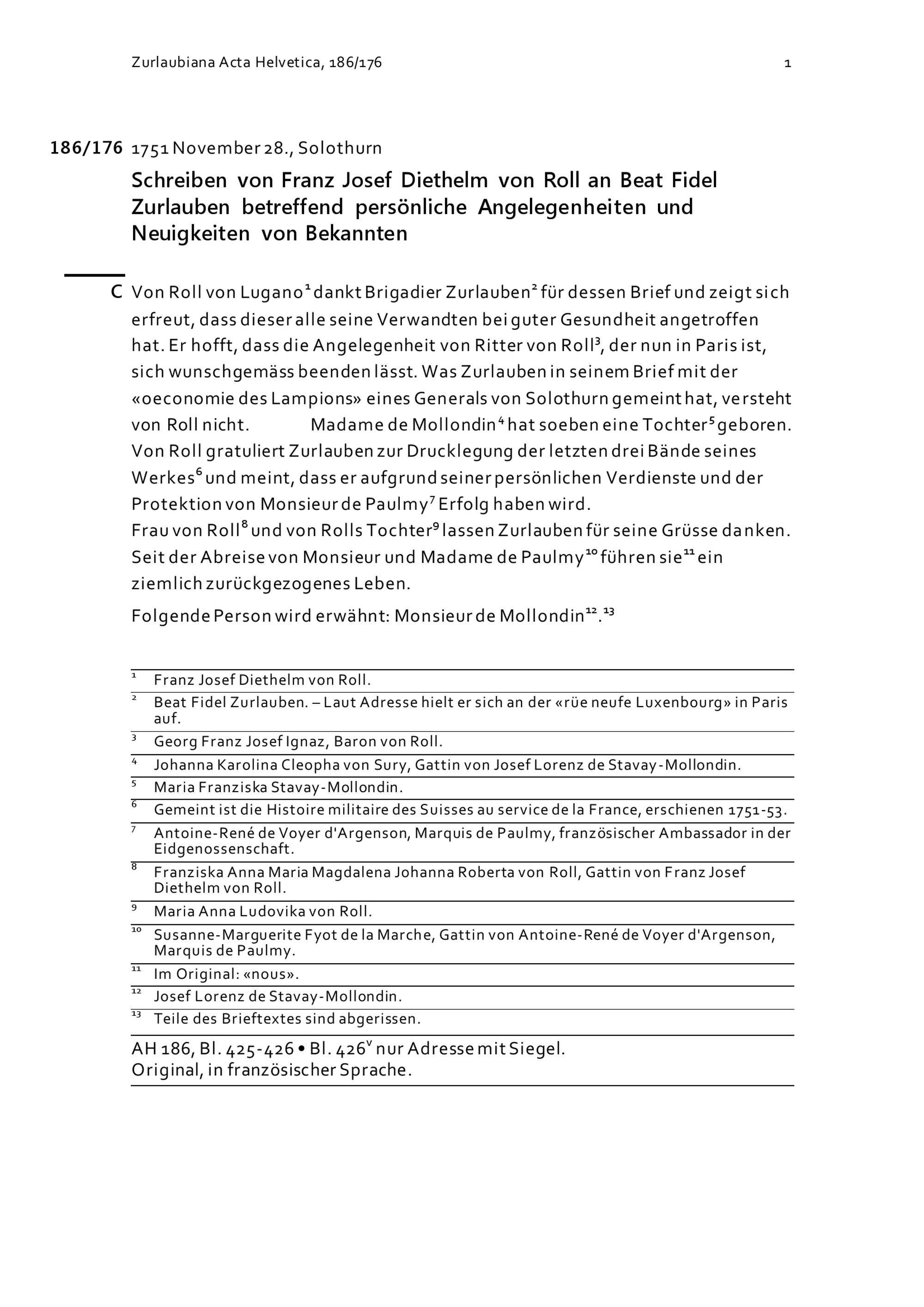 Schreiben von Franz Josef Diethelm von Roll an Beat Fidel Zurlauben betreffend persönliche...