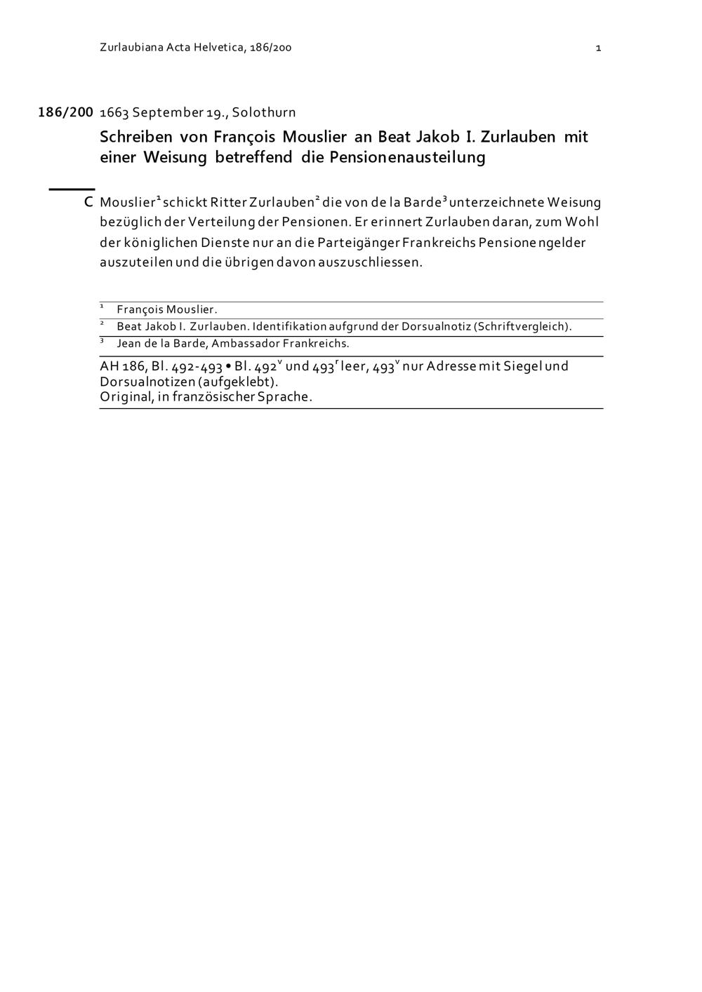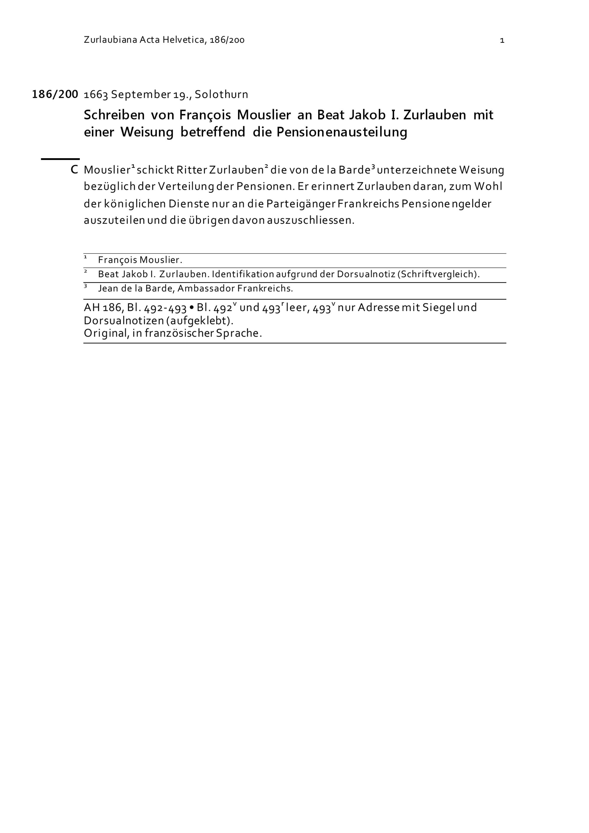 Schreiben von François Mouslier an Beat Jakob I. Zurlauben mit einer Weisung betreffend die Pensionenausteilung