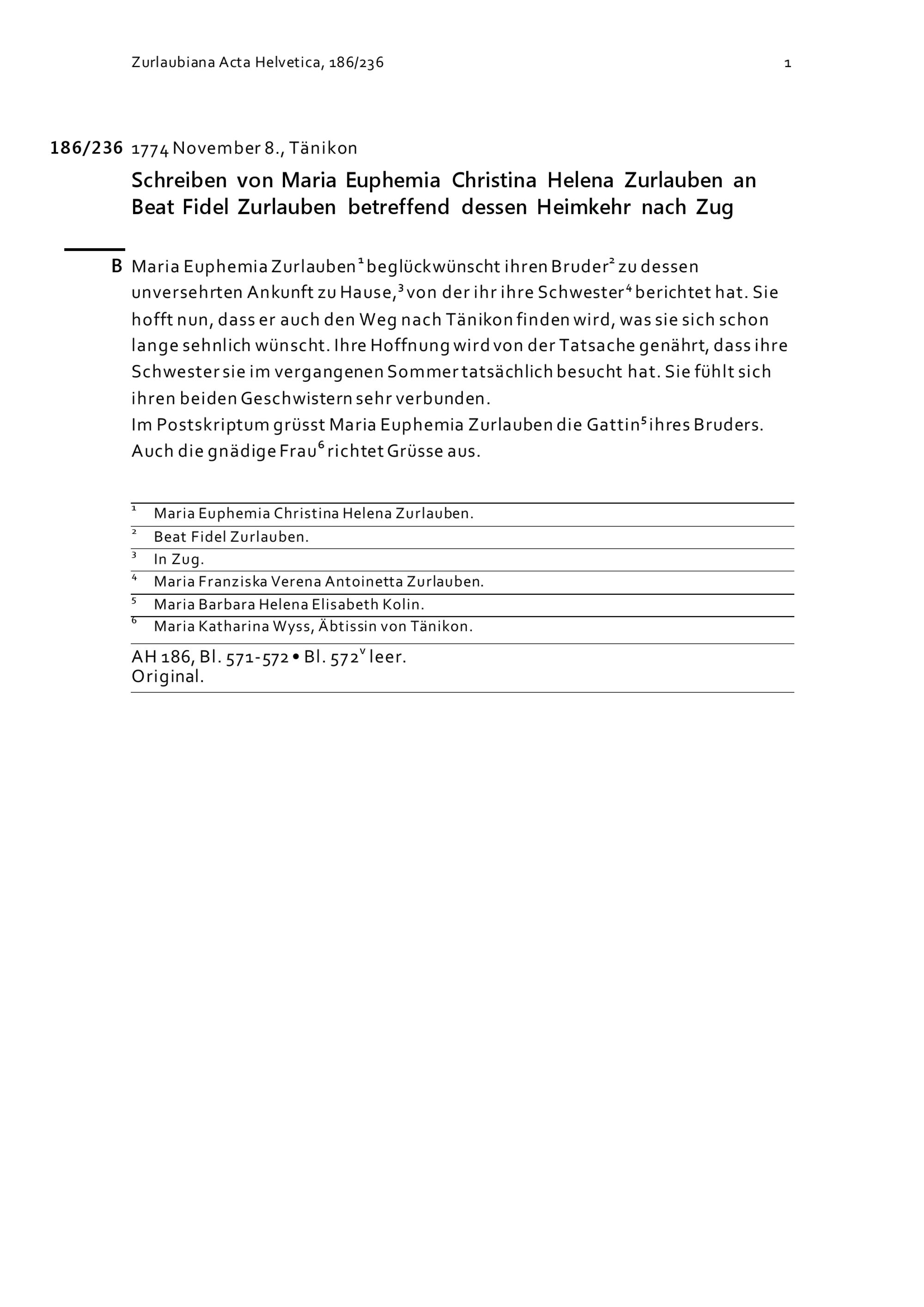 Schreiben von Maria Euphemia Christina Helena Zurlauben, Klosterfrau in Tänikon,...