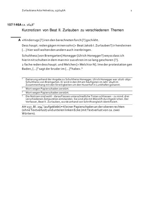 Kurznotizen von Beat II. Zurlauben zu verschiedenen Themen