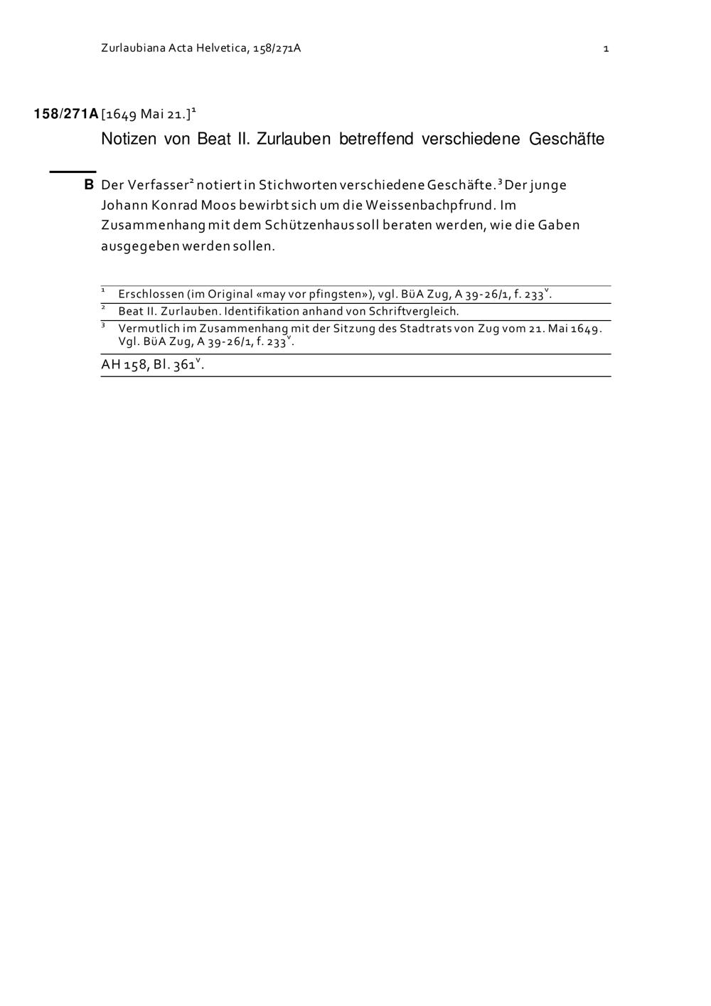 Notiz von Beat II. Zurlauben betreffend verschiedene Geschäfte