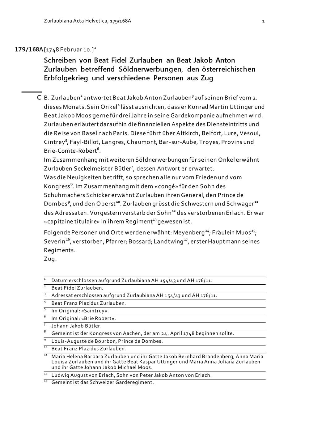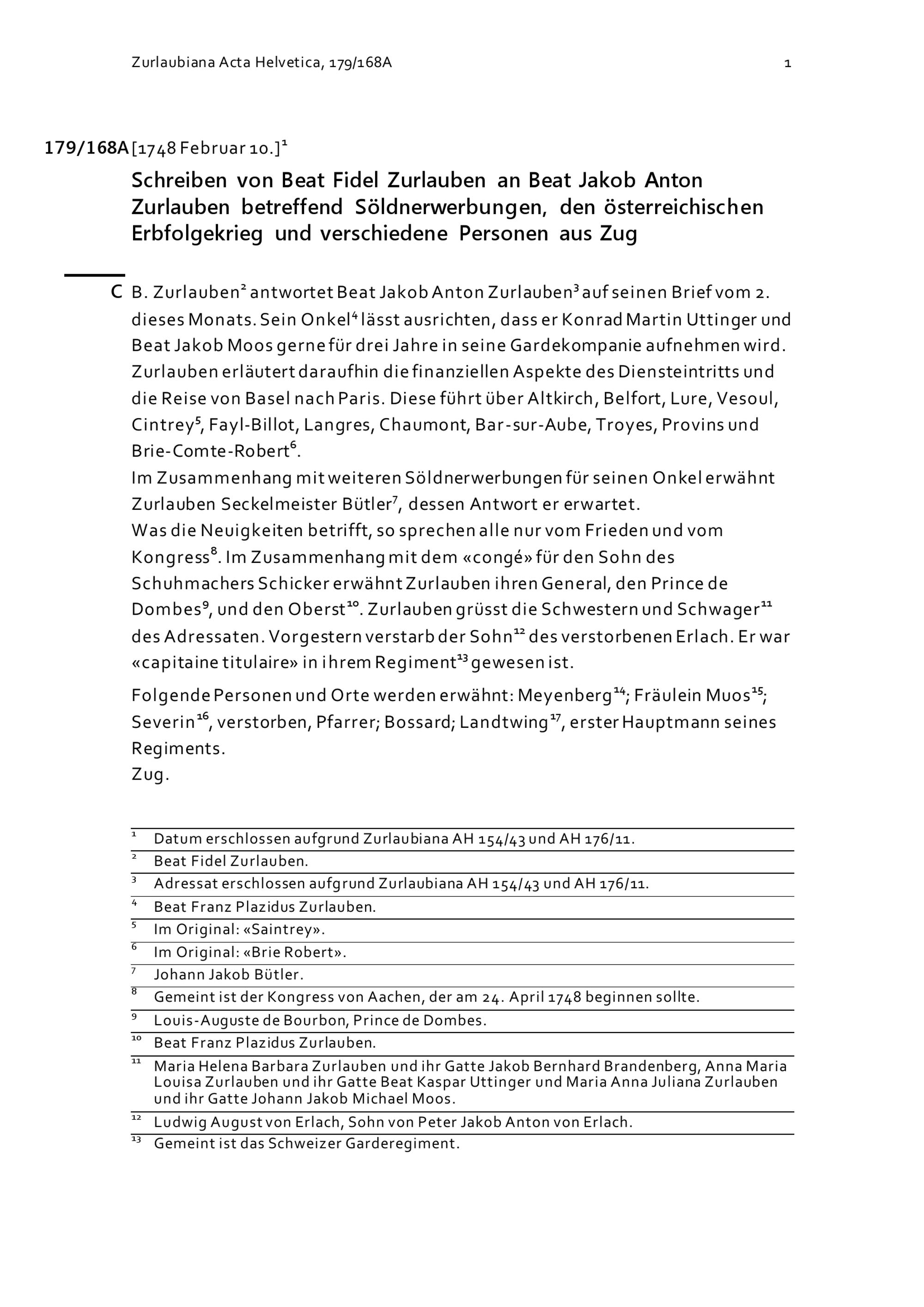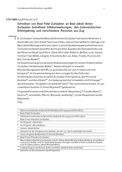 Schreiben von Beat Fidel Zurlauben an Beat Jakob Anton Zurlauben betreffend Söldnerwerbungen, den österreichischen Erbfolgekrieg und verschiedene Personen aus Zug
