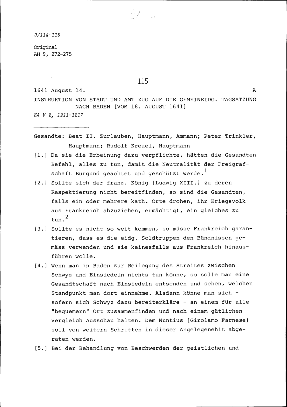 Instruktion von Stadt und Amt Zug auf die Jahrrechnung in Baden vom 30. Juni 1641