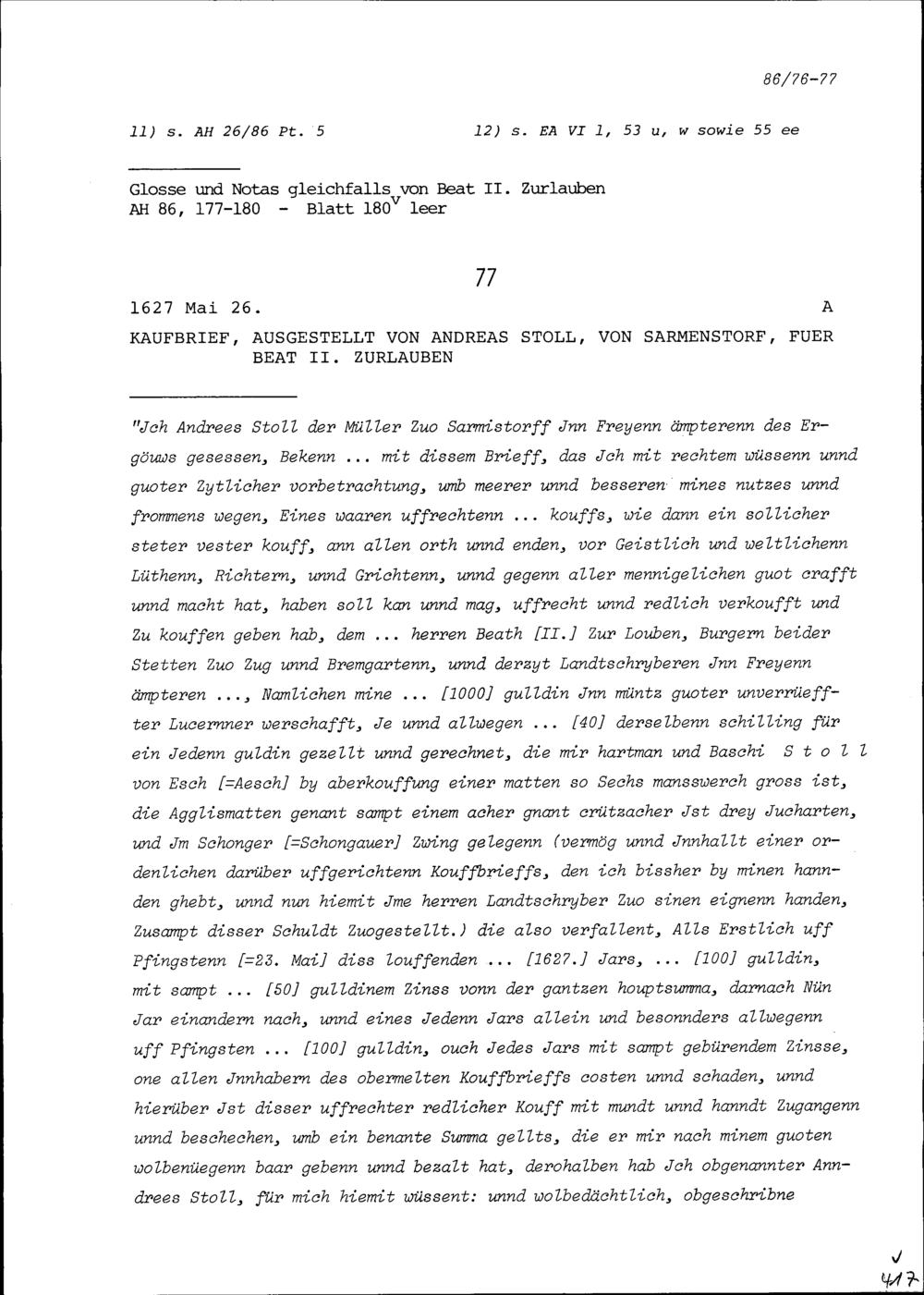Bericht, verfasst von Beat II. Zurlauben, Stadt- und Amtrat Zug, zur Tagsatzung der Dreizehn Orte in Baden