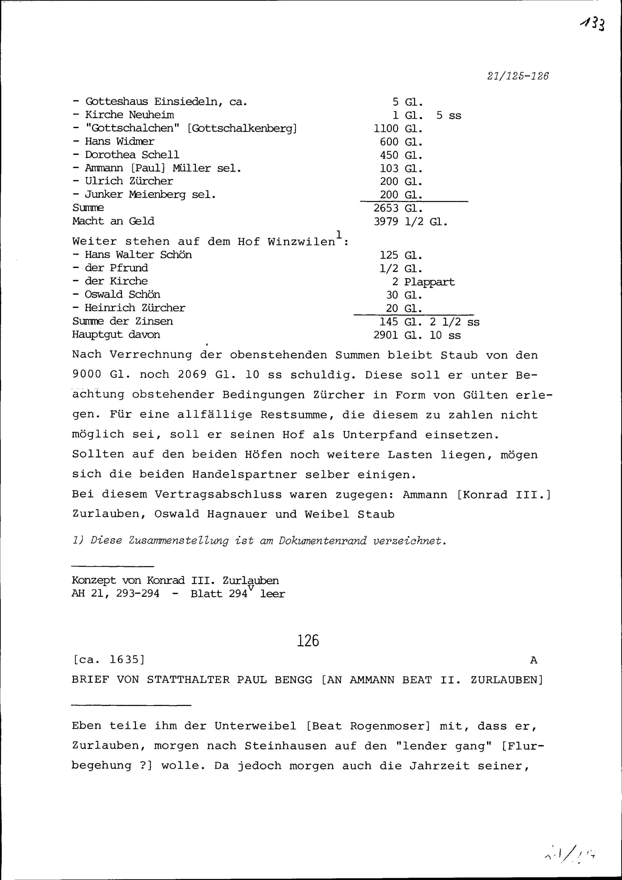 Schreiben von Paul Bengg, Statthalter, an Beat II. Zurlauben, Ammann