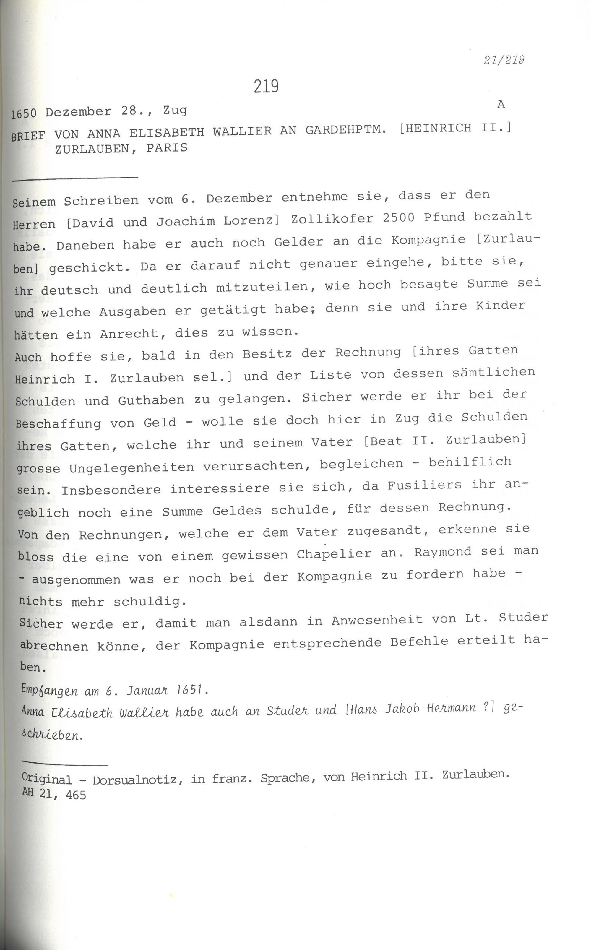 Schreiben von Anna Elisabeth Wallier an Heinrich II. Zurlauben, Gardehauptmann, Paris