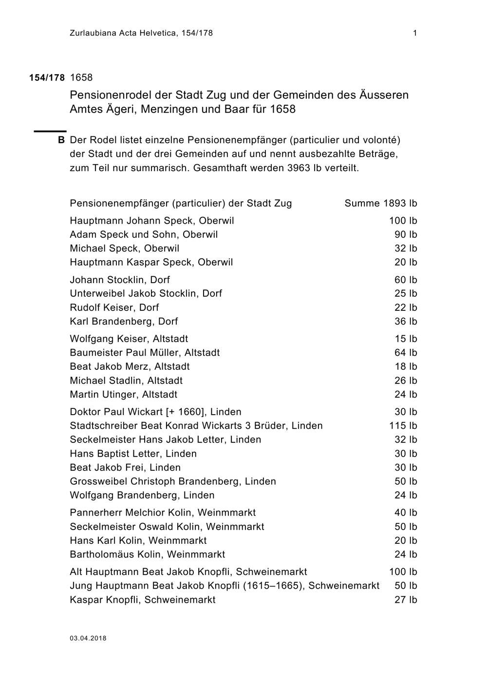 Pensionenrodel der Stadt Zug und der drei Gemeinden des Äusseren Amtes Ägeri, Menzingen und Baar für 1658