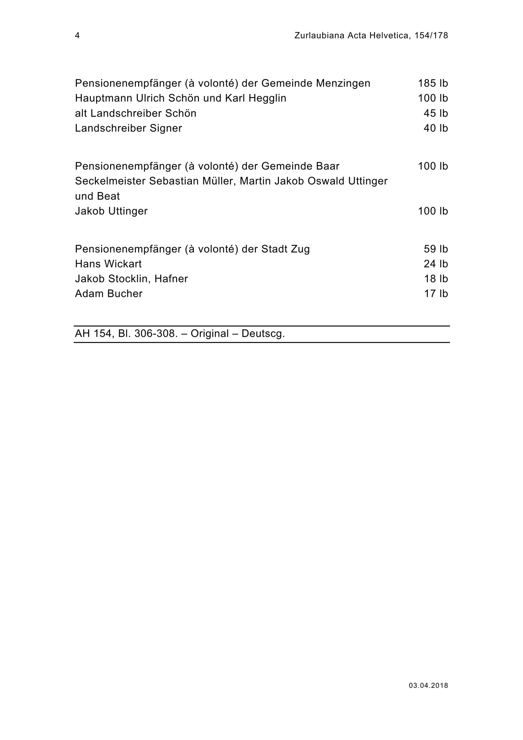 Pensionenrodel der Stadt Zug und der drei Gemeinden des Äusseren Amtes Ägeri, Menzingen...