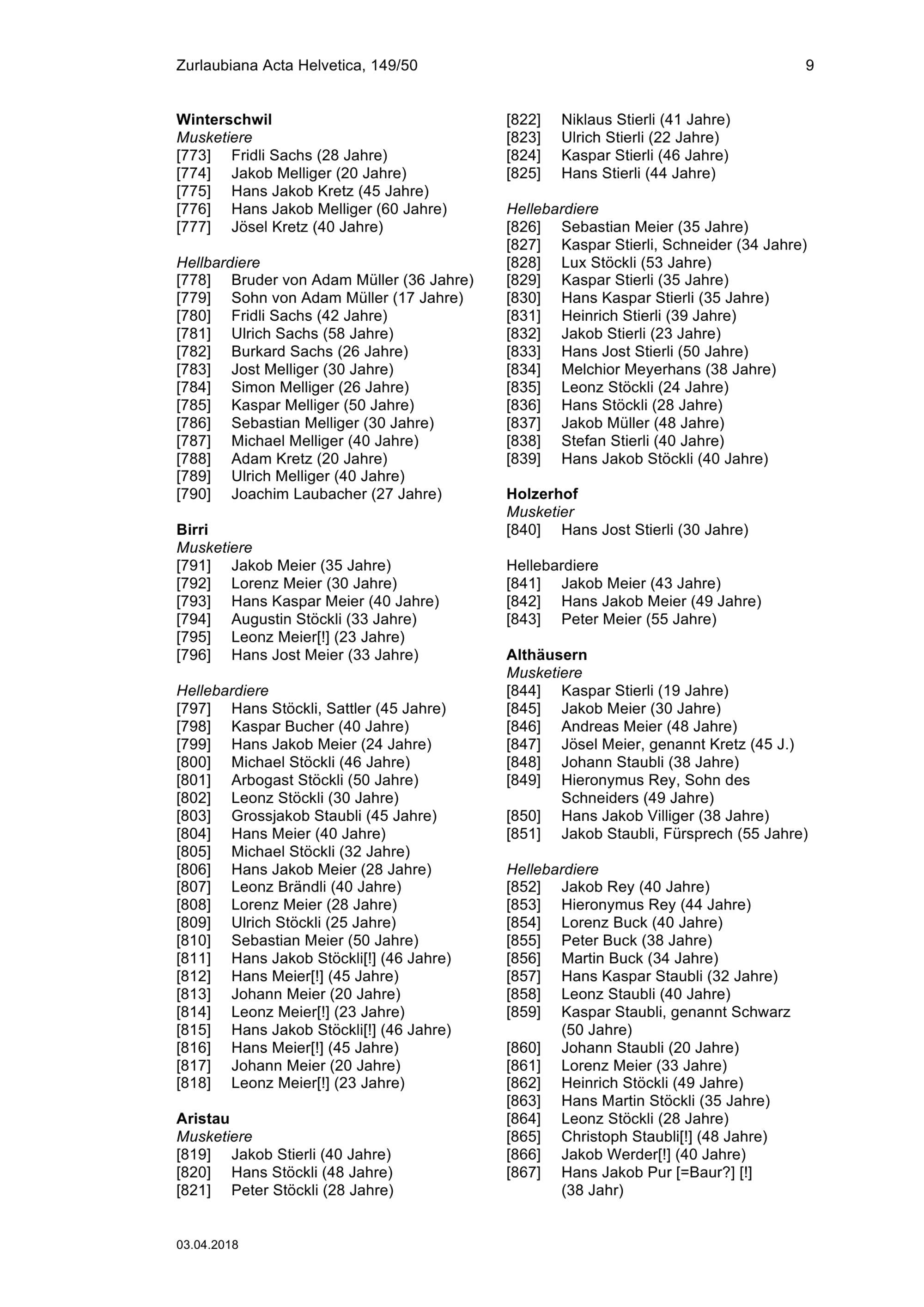 Mannschaftsrodel (= wehrpflichtige Männer) der Freien Ämter