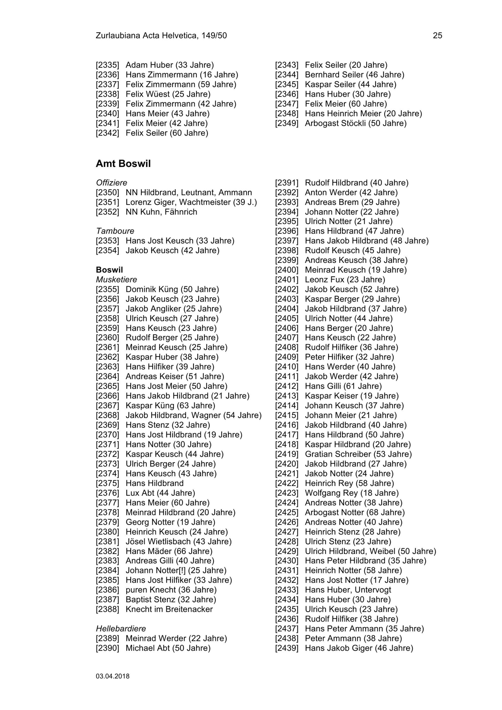 Mannschaftsrodel (= wehrpflichtige Männer) der Freien Ämter