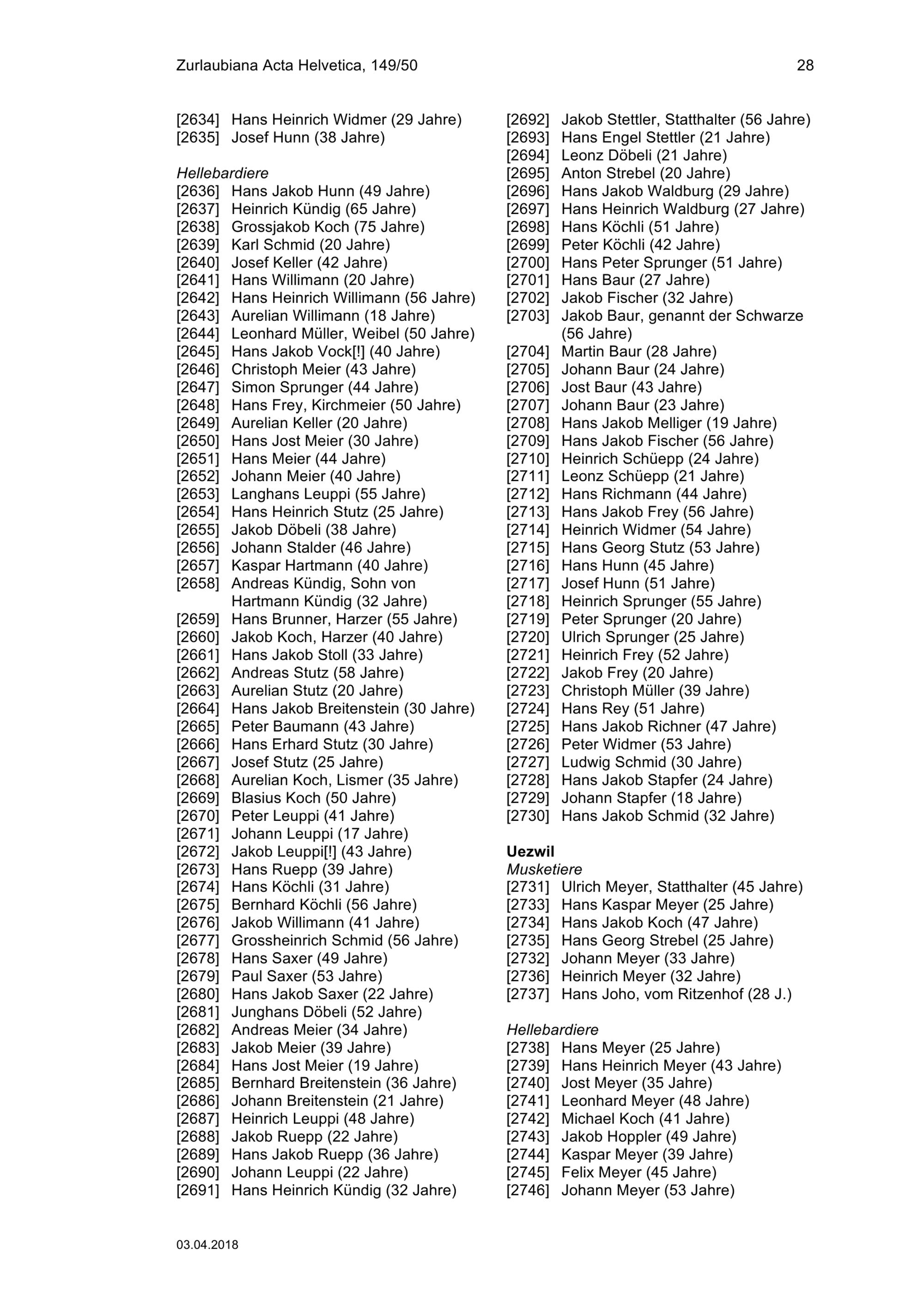 Mannschaftsrodel (= wehrpflichtige Männer) der Freien Ämter