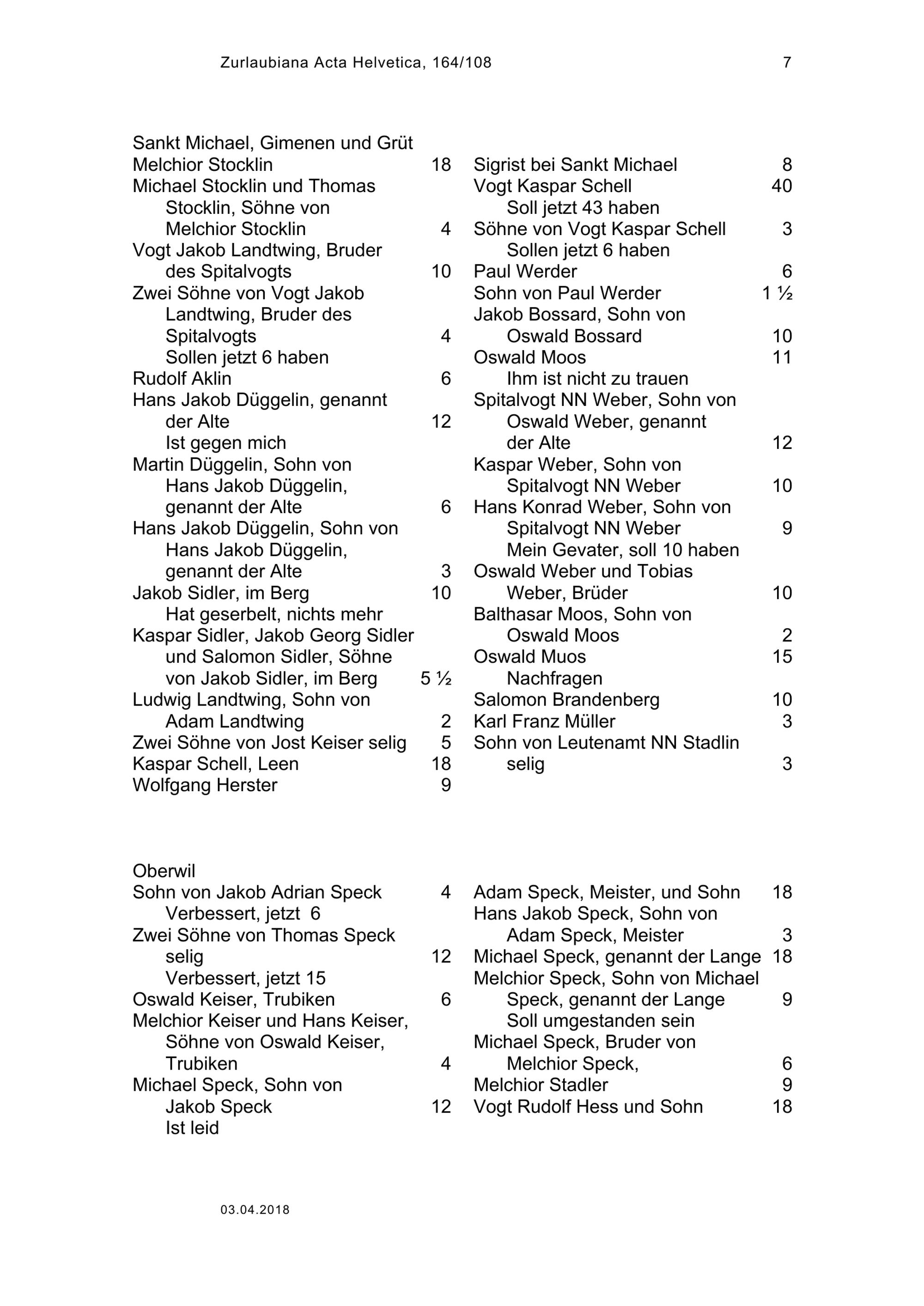 Pensionenrodel der Stadt Zug: Empfänger nach Nachbarschaften