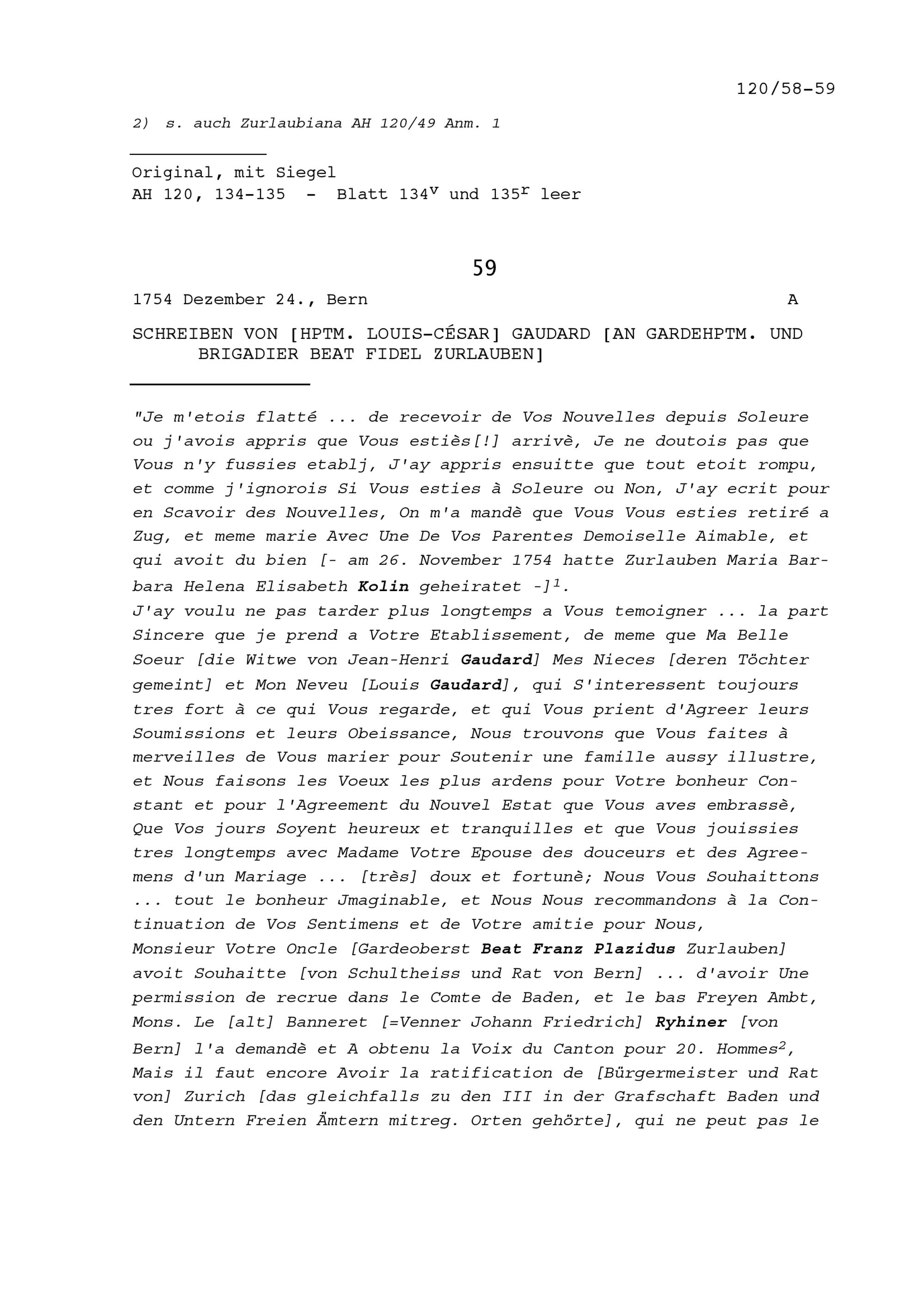 Schreiben von Louis-César Gaudard, Hauptmann, an Beat Fidel Zurlauben, Gardehauptmann und Brigadier