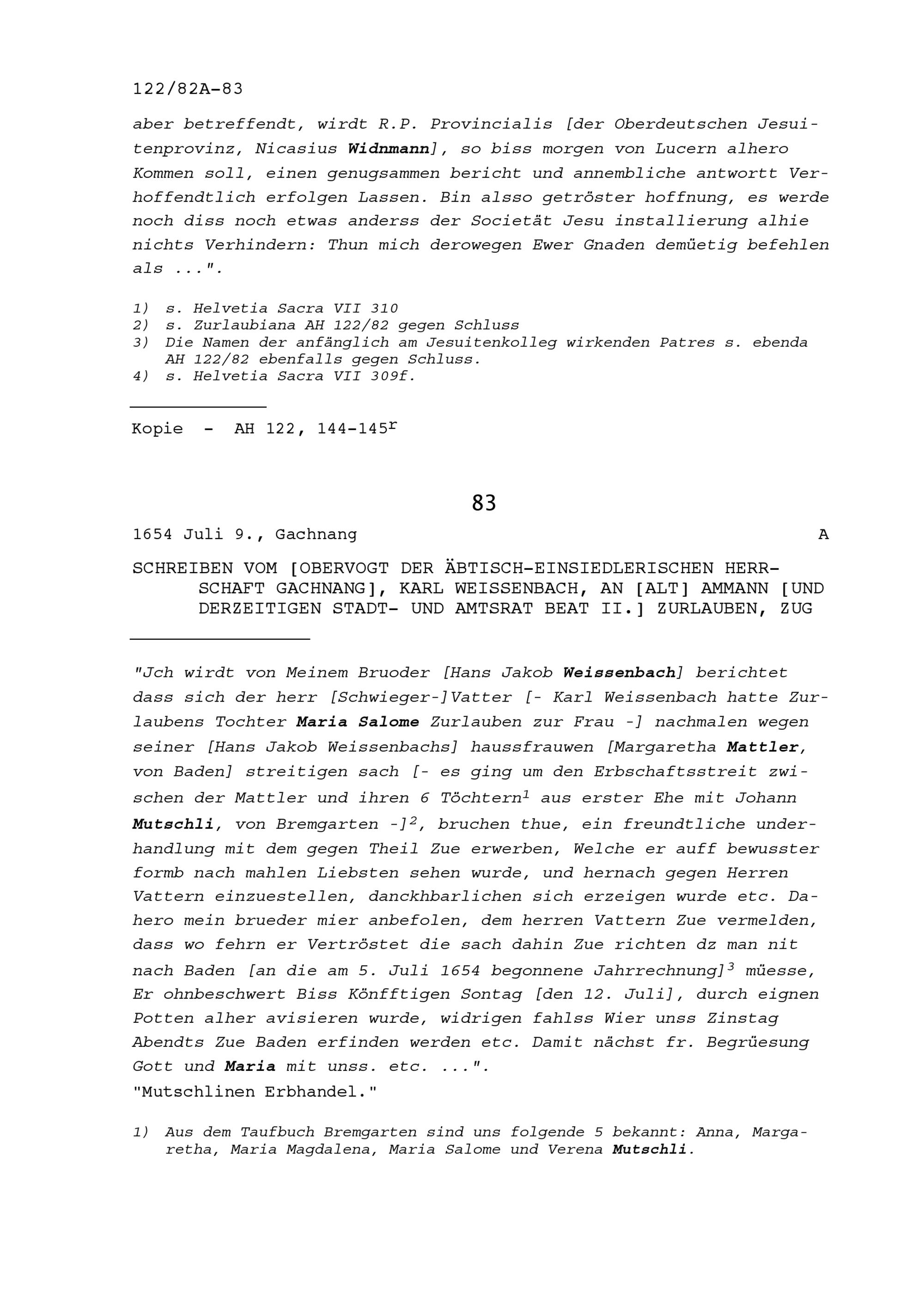 Schreiben von Karl Weissenbach, Obervogt der äbtisch-einsiedlerischen Herrschaft Gachnang, an Beat II. Zurlauben, Altammann und Stadt- und Amtrat, Zug
