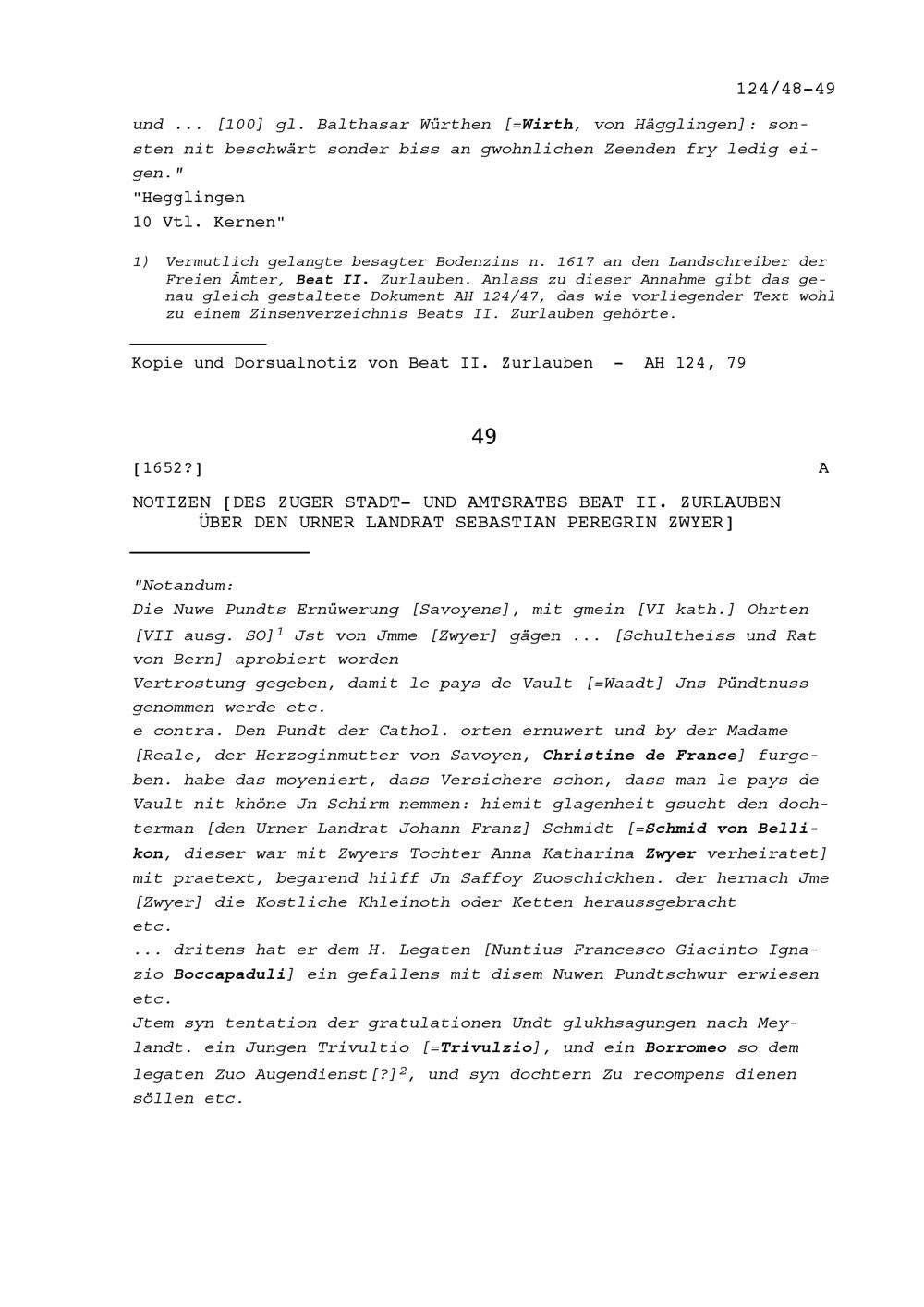 Notiz von Beat II. Zurlauben, Stadt- und Amtrat Zug, über Sebastian Peregrin Zwyer, Landrat Uri