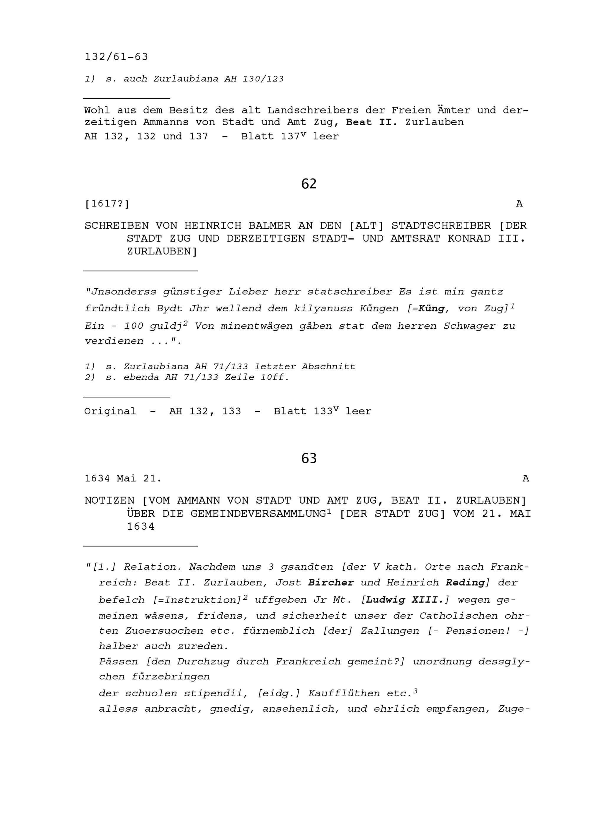 Schreiben von Heinrich Balmer an Konrad III. Zurlauben, Altstadtschreiber der Stadt Zug und Stadt- und Amtrat