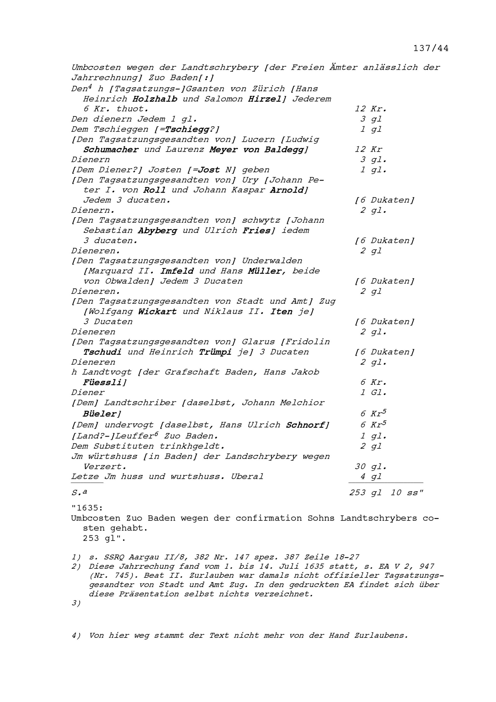 Abrechnung bezüglich der Kosten für die Präsentation von Beat Jakob I. Zurlauben als neuen Landschreiber der Freien Ämter auf der Jahrrechnung in Baden, erstellt von Beat II. Zurlauben, Stadt- und Amtrat Zug,