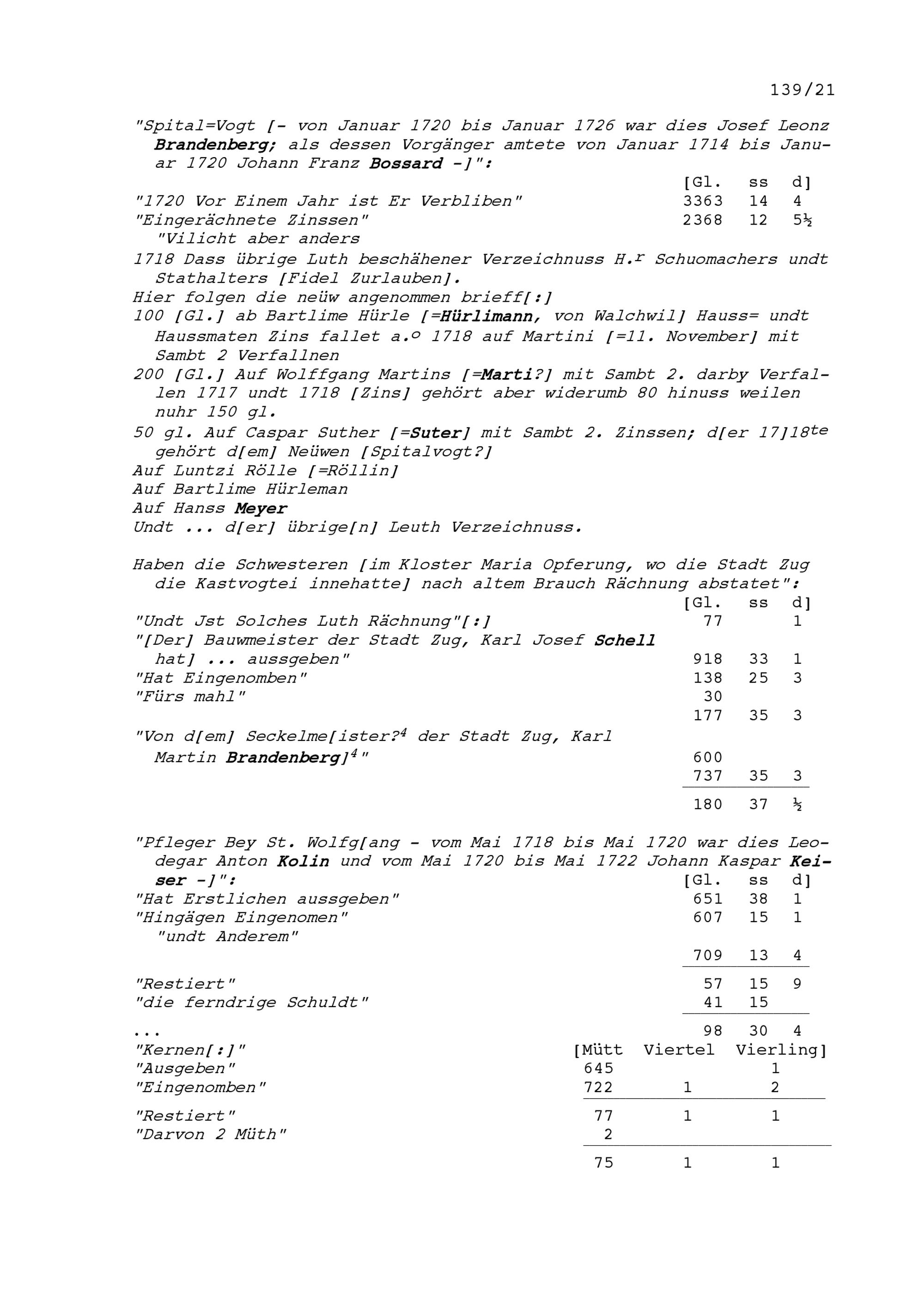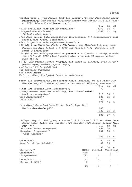 Jahrrechnung der Stadt Zug für das Jahr 1720 (Auszug)