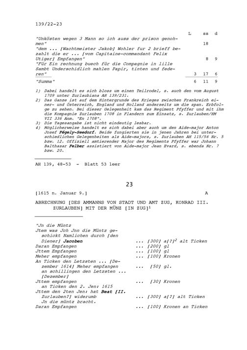 Abrechnung von Konrad III. Zurlauben, Ammann von Stadt und Amt Zug, mit der Münz in Zug