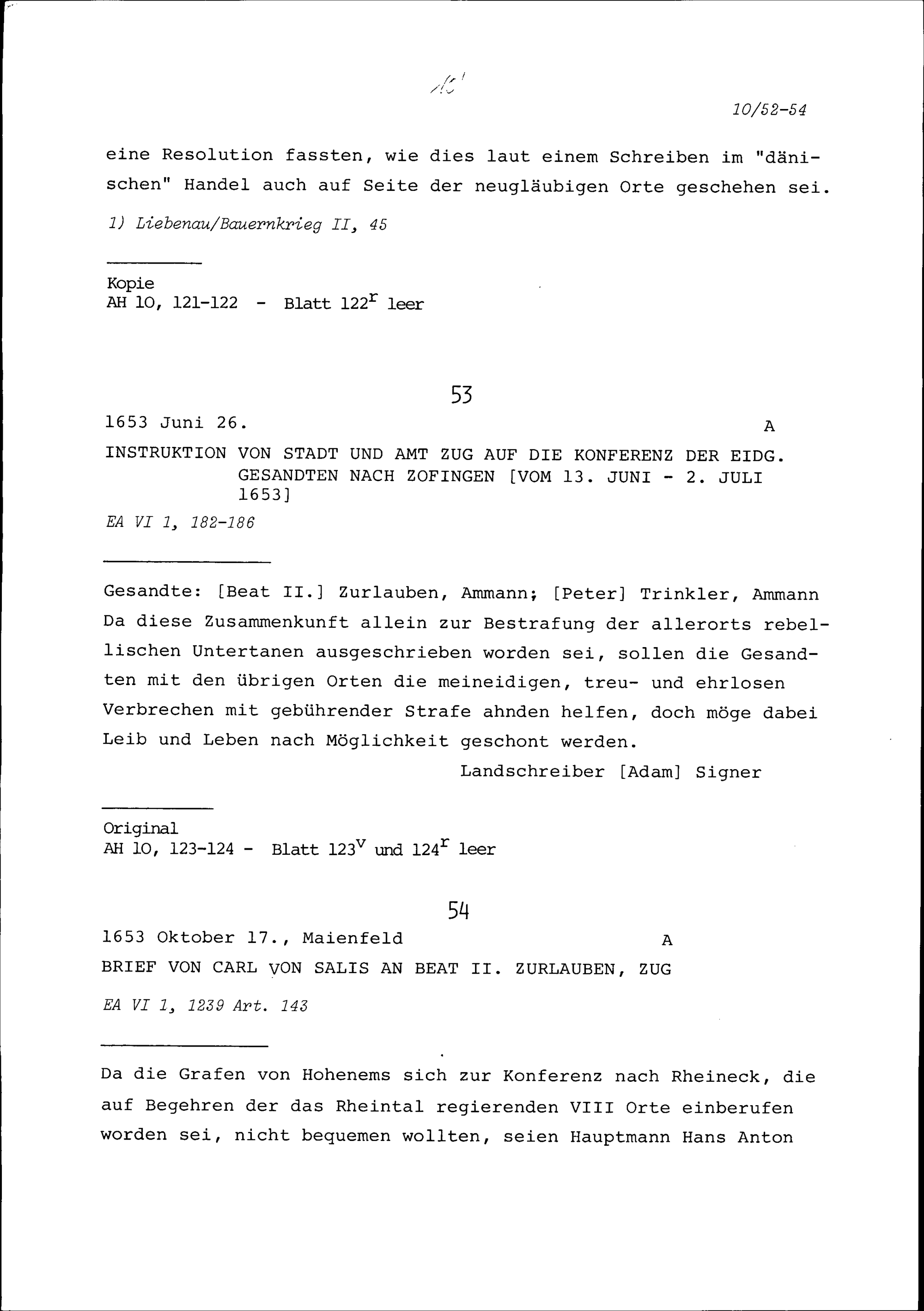 Instruktion von Stadt und Amt Zug auf die Konferenz der eidgenössischen Gesandten in Zofingen vom 13. Juni bis 2. Juli 1653