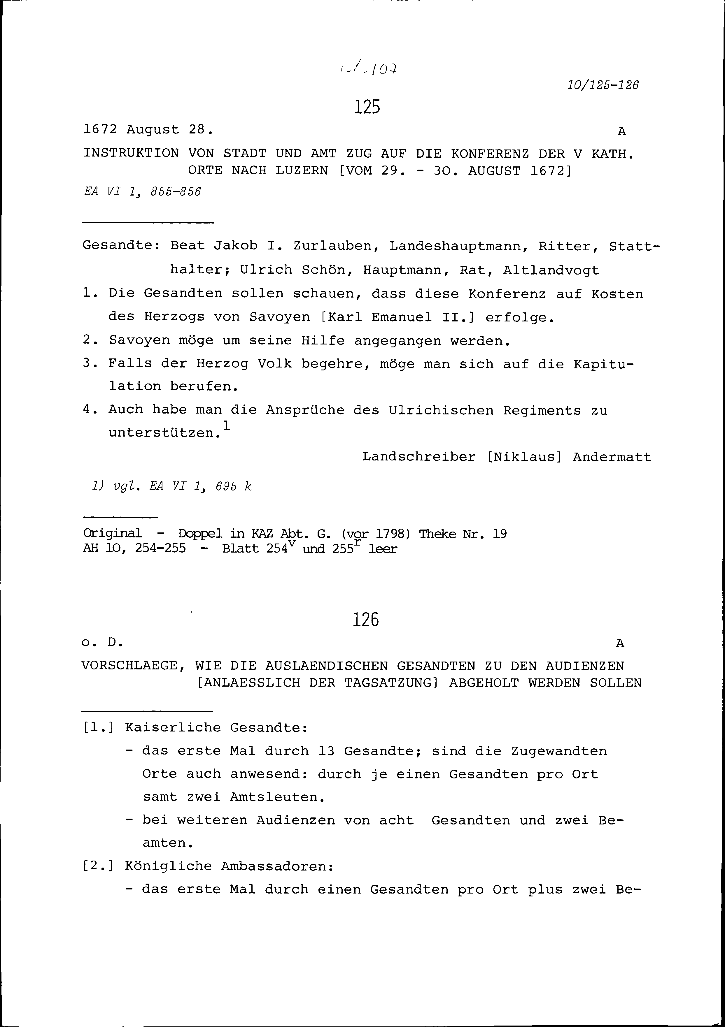 Instruktion von Stadt und Amt Zug auf die Konferenz der Fünf Katholischen Orte in Luzern vom 29. bis 30. August 1672