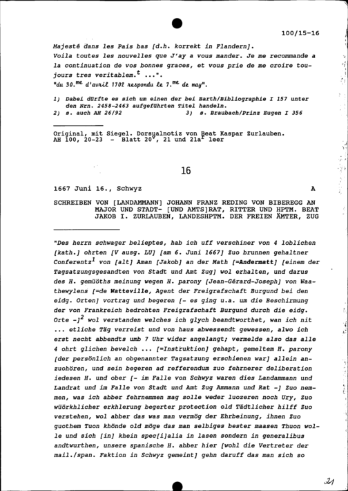 Schreiben von Johann Franz Reding von Biberegg, Landammann, an Beat Jakob I. Zurlauben, Landeshauptmann der Freien Ämter, Major und Stadt- und Amtrat, Zug