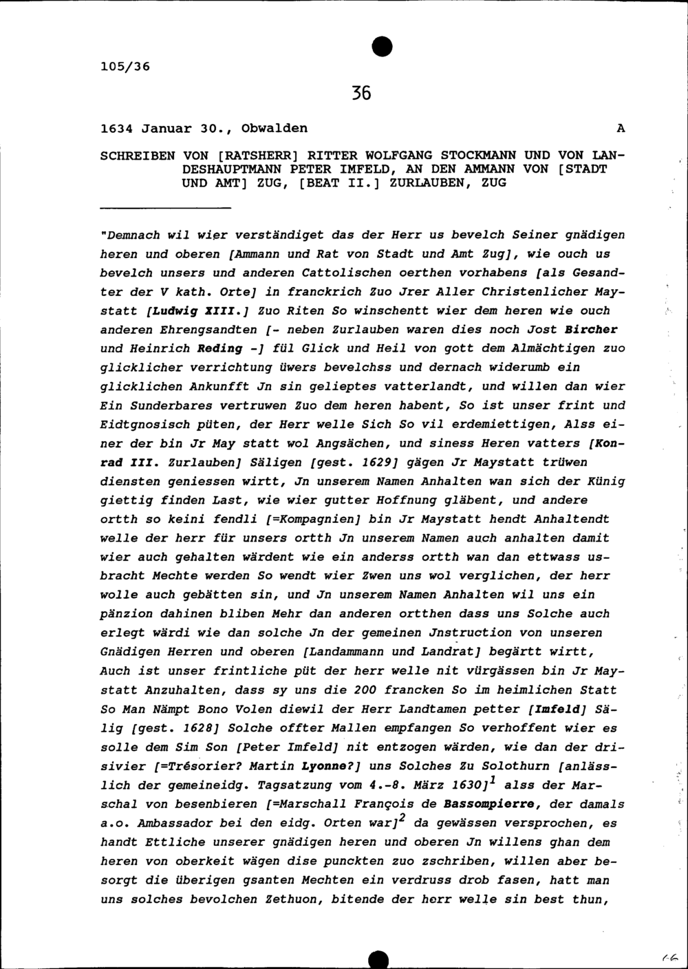 Schreiben von Wolfgang Stockmann, Ratsherr, und von Peter Imfeld, Landeshauptmann, an Beat II. Zurlauben, Ammann von Stadt und Amt Zug, Zug