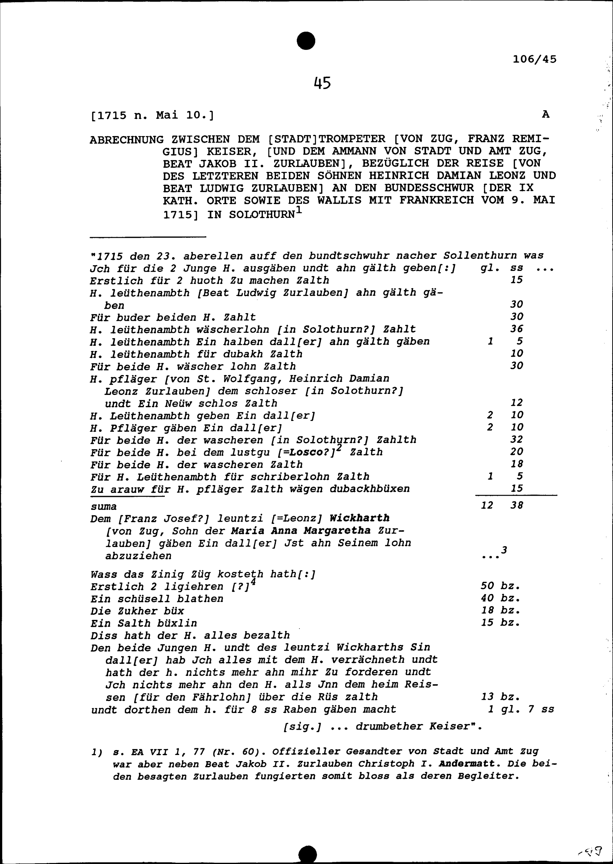 Abrechnung zwischen Franz Remigius Keiser, Stadttrompeter und Werber, von Zug, und Beat Jakob II. Zurlauben, Ammann von Stadt und Amt Zug, bezüglich der Reise von des letzteren beiden Söhnen Heinrich Damian Leonz Zurlauben und Beat Ludwig Zurlauben an den Bundesschwur der Neun Katholischen Orte sowie des Wallis mit Frankreich vom 9. Mai 1715 in Solothurn