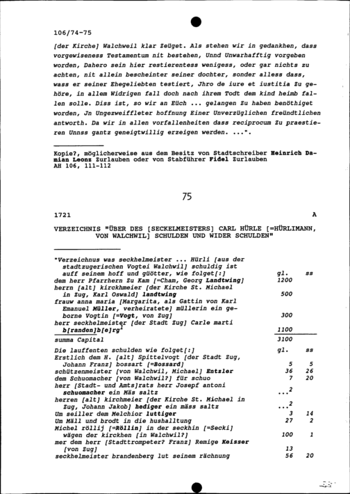 Schulden und Widerschulden von Karl Hürlimann, Seckelmeister, von Walchwil
