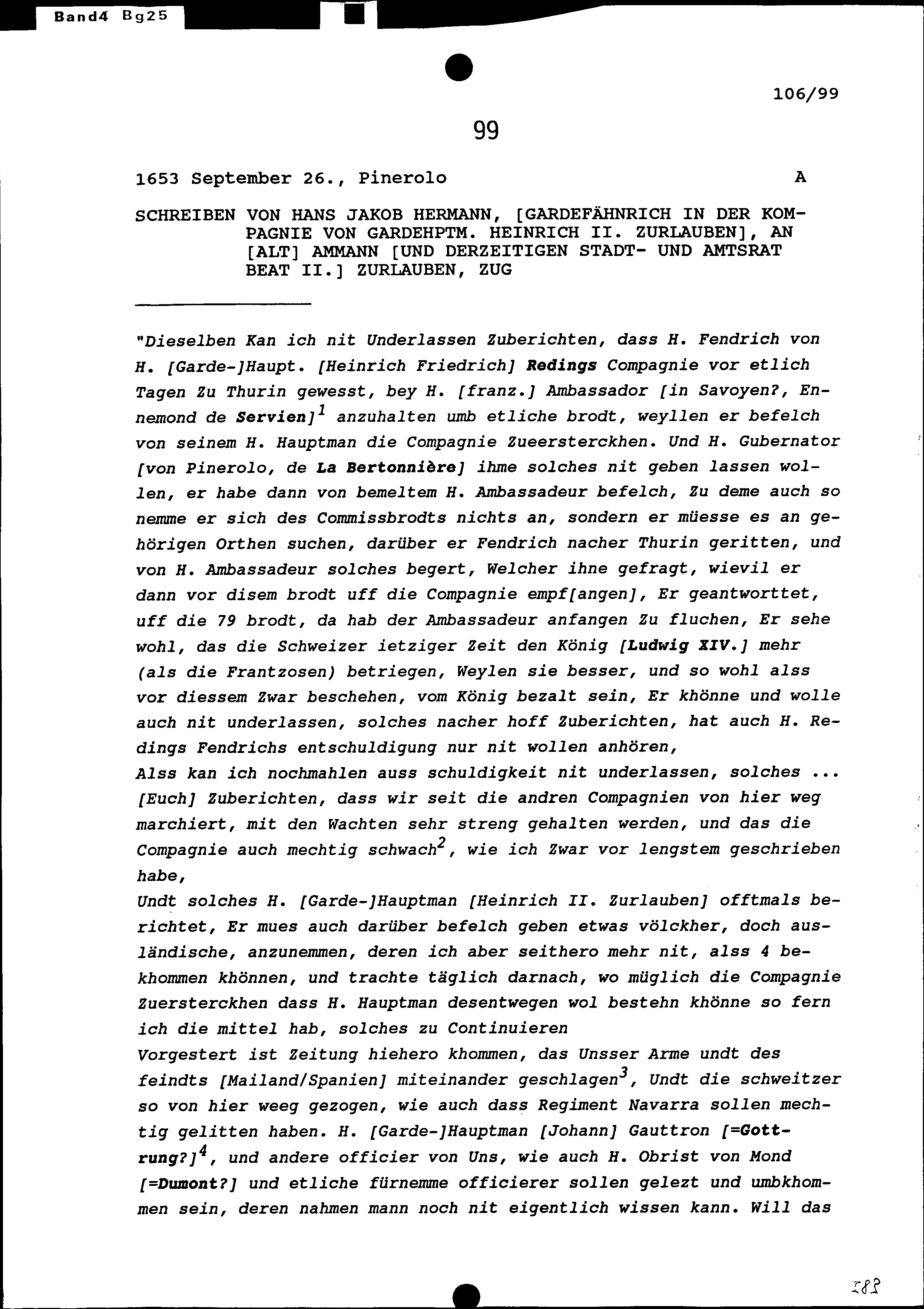 Schreiben von Hans Jakob Hermann, Gardefähnrich in der Kompanie von Heinrich II....