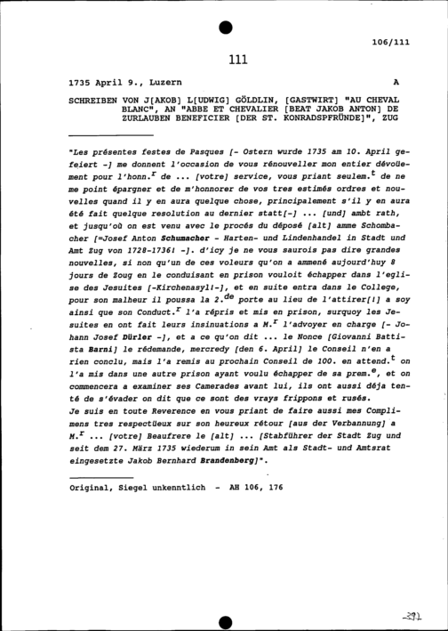 Schreiben von Jakob Ludwig Göldlin, Gastwirt im Weissen Rössli, an Beat Jakob Anton Zurlauben, Priester und Benefiziat der Sankt Konradspfrund, Zug