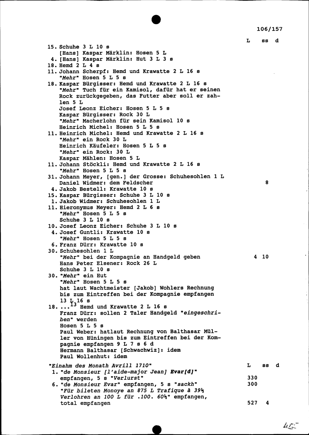 Mannschaftsrodel der Kompanie von Beat Jakob II. Zurlauben im Regiment Pfyffer, verfasst von Hans Kaspar Schreiber, Fähnrich