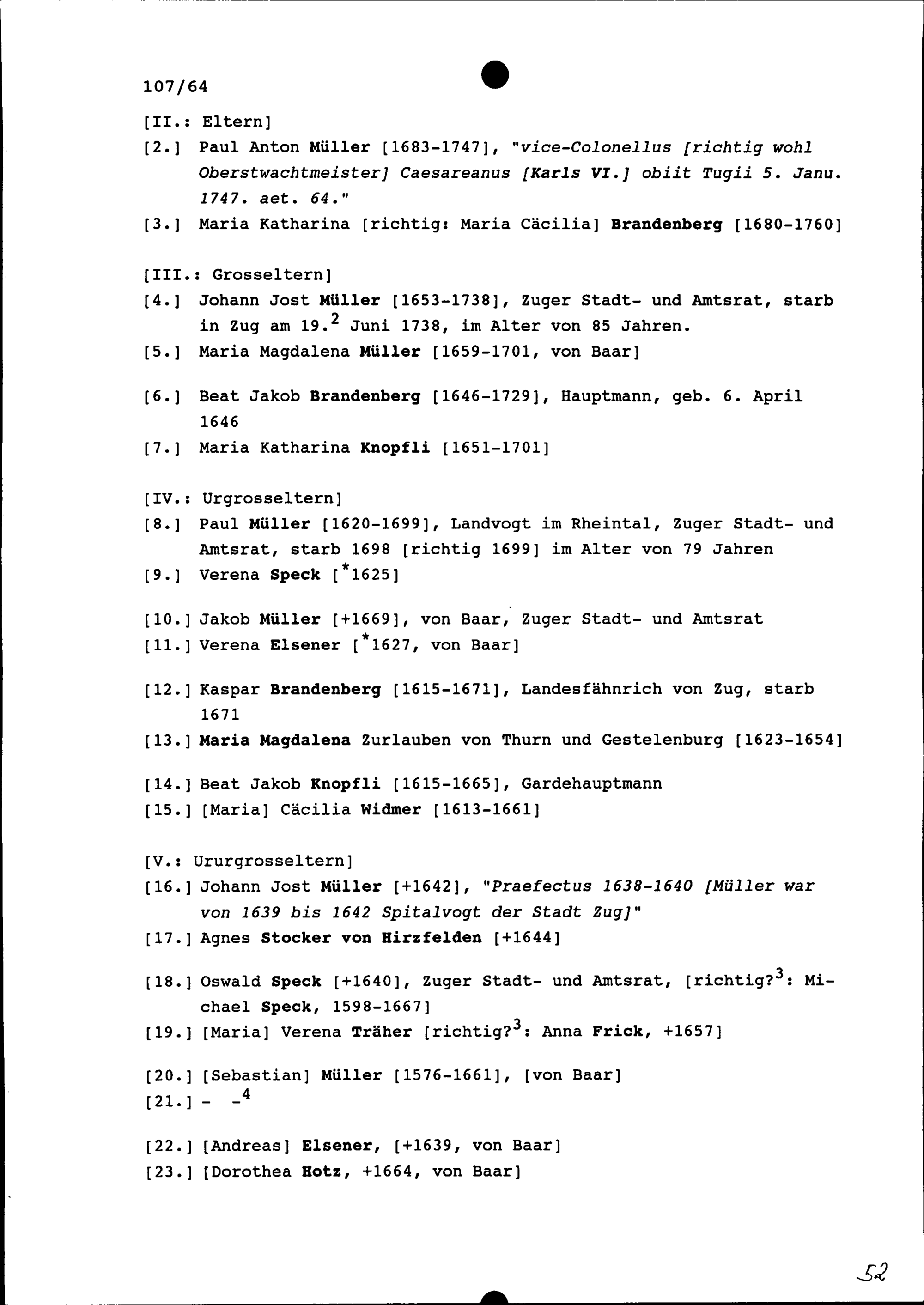 Genealogisches zu Anna Maria Emerentia Müller von Zug, aufgezeichnet von Beat Fidel Zurlauben