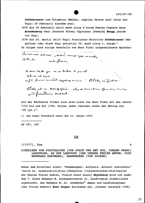 Schreiben von Johann Franz Landtwing, Statthalter von Stadt und Amt Zug, an Jost...