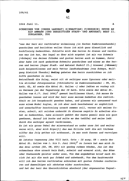 Schreiben von Sebastian Peregrin Zwyer, Landrat Uri, an Beat II. Zurlauben, Altammann...