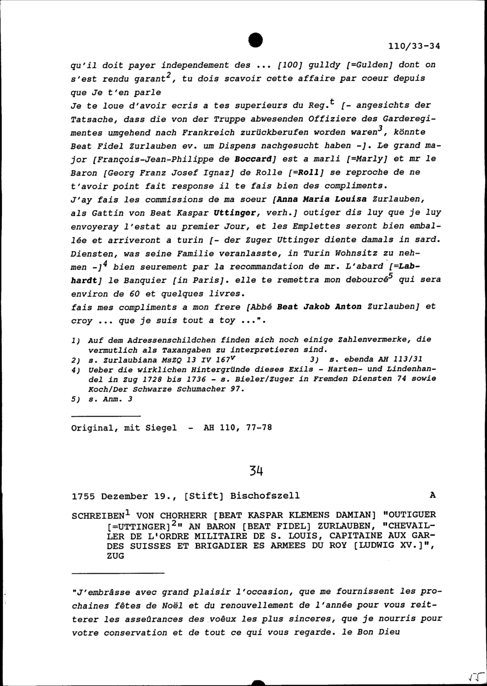 Schreiben von Beat Kaspar Klemens Damian Uttinger, Chorherr, an Beat Fidel Zurlauben, Brigadier, Zug