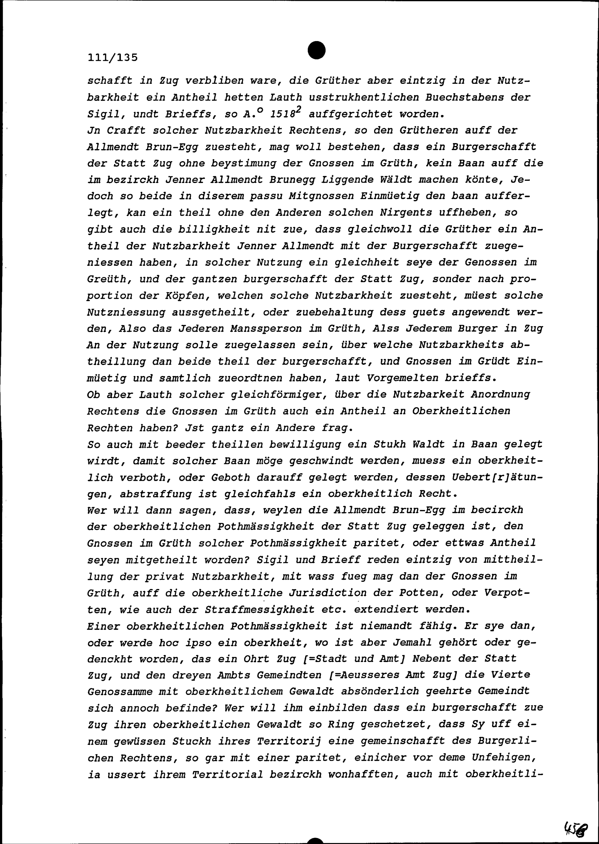 Stellung der Stadt Zug im Rechtsprechungsstreit mit den Genossen im Grüt zu Baar