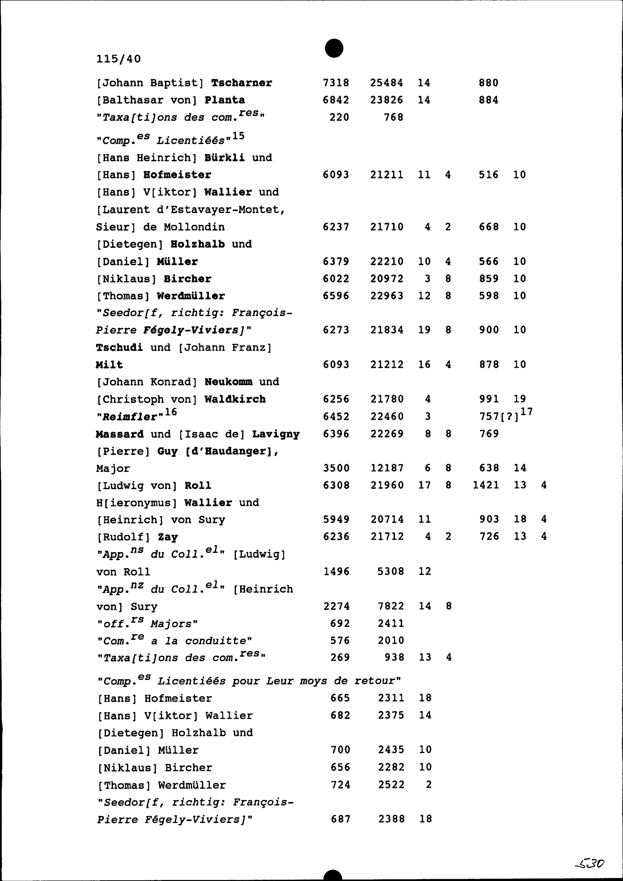 Pensionenübersicht für die neuen Regimenter und Schweizer Kompanien in Frankreich basierend auf Abmachungen mit den Gesandten der Dreizehn Orte Johann Jakob vom Staal, Vinzenz Wagner, Rodolphe de Weck und Hans Konrad Werdmüller