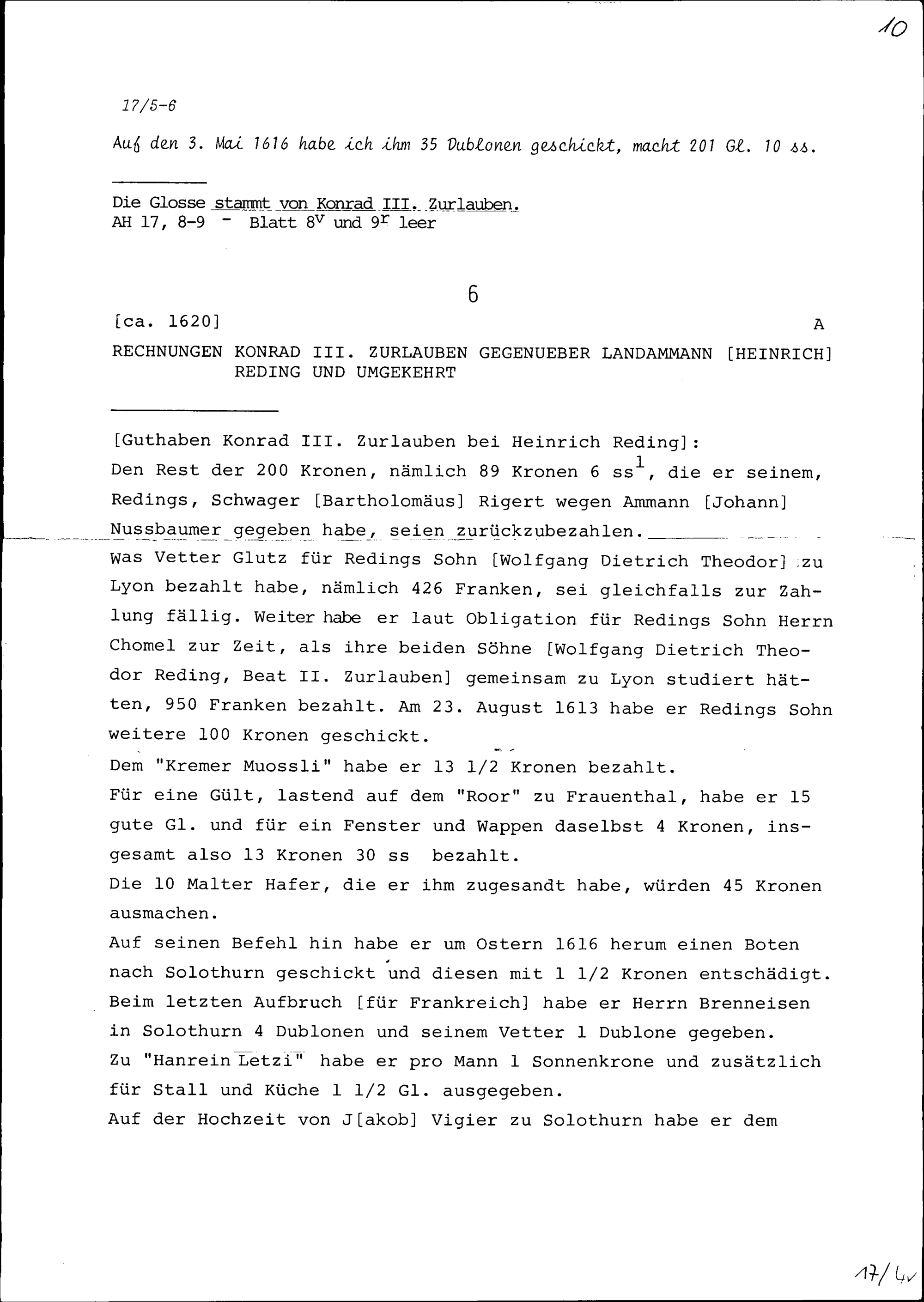Rechnungen von Konrad III. Zurlauben gegenüber Heinrich Reding, Landammann, und ...