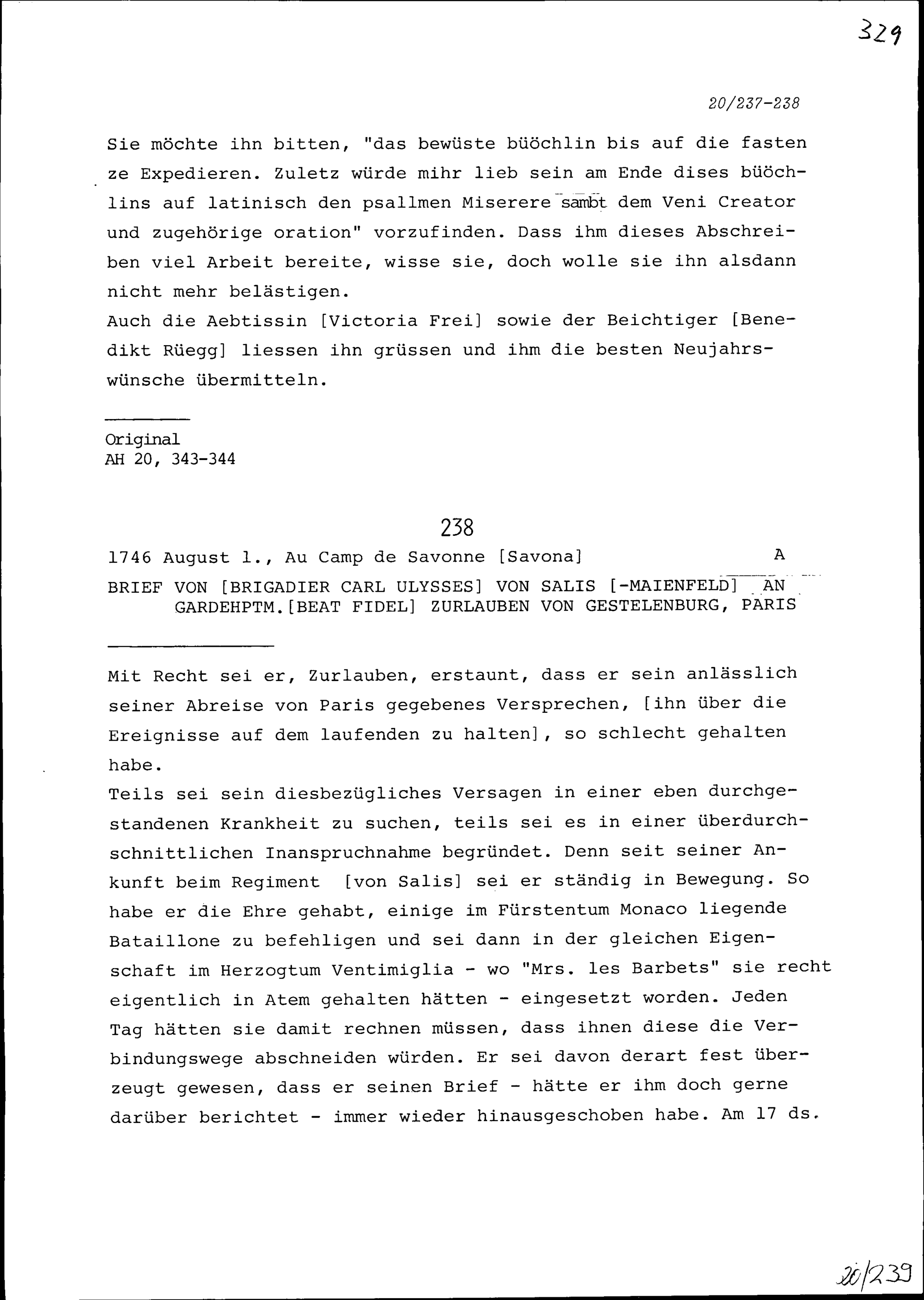 Schreiben von Carl Ulysses von Salis, Brigadier, Maienfeld, an Beat Fidel Zurlauben, Gardehauptmann, Paris