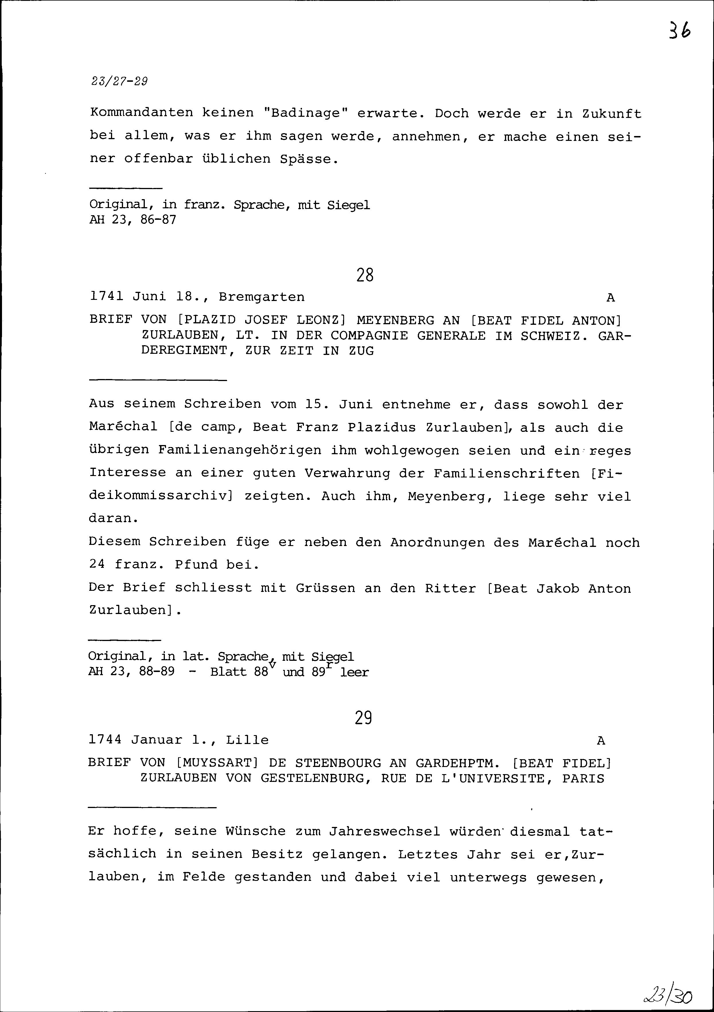 Schreiben von Plazid Josef Leonz Meyenberg an Beat Fidel Anton Zurlauben, Leutnant in der Kompanie im Schweizer Garderegiment, zur Zeit in Zug