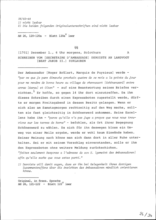 Schreiben von NN Deroiste, Botschaftssekretär, an Beat Jakob II. Zurlauben, Land...