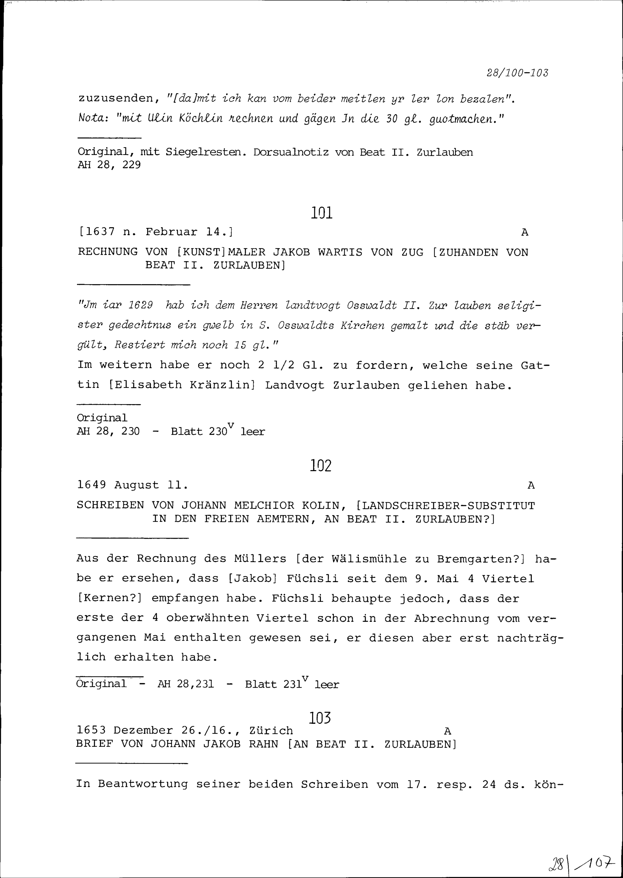 Rechnung von Jakob Wartis, Kunstmaler, Zug, zuhanden von Beat II. Zurlauben