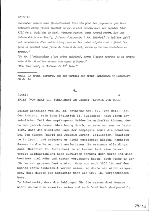 Schreiben von Beat II. Zurlauben an Ludwig von Roll, Oberst