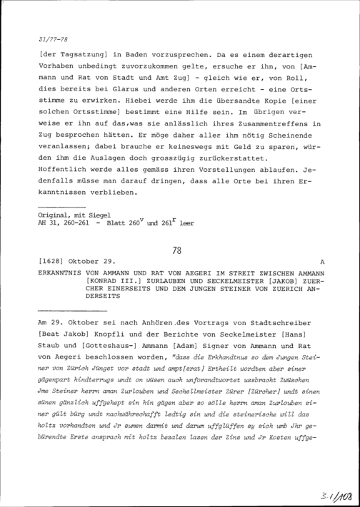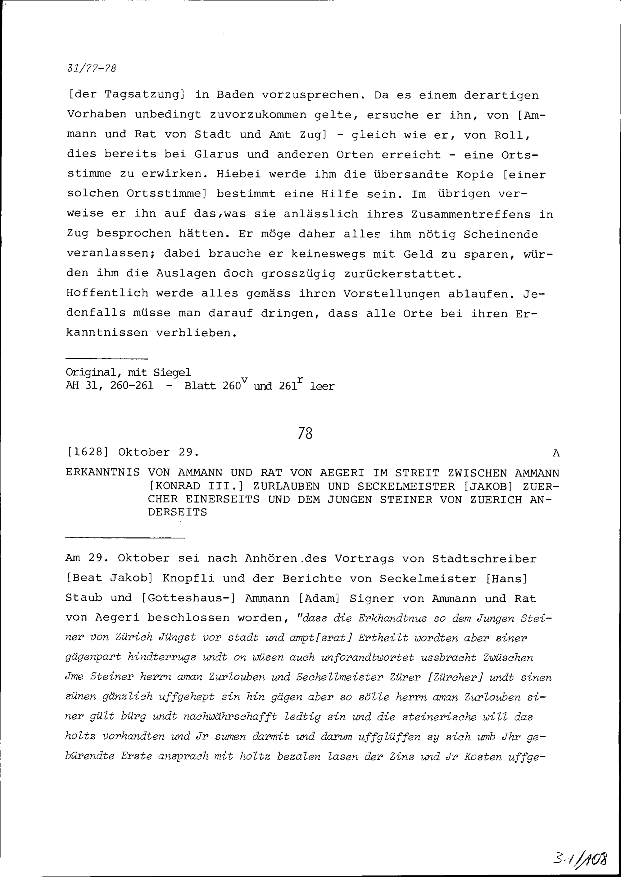 Beschluss des Ammanns und Rats von Ägeri im Streit zwischen Konrad III. Zurlauben, Ammann, und Jakob Zürcher, Seckelmeister, einerseits und NN Steiner jun. von Zürich anderseits