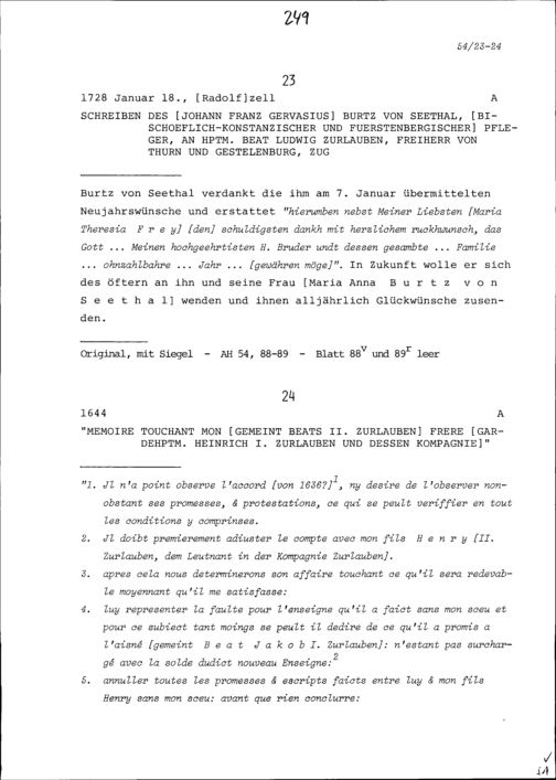 Schreiben von Johann Franz Gervasius Burtz von Seethal, bischöflich-konstanzischer und fürstenbergischer Pfleger, an Beat Ludwig Zurlauben, Hauptmann, Zug