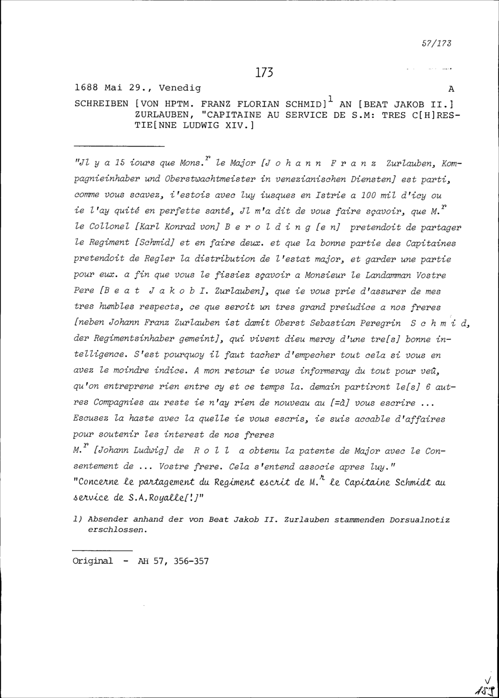Schreiben von Franz Florian Schmid, Hauptmann, an Beat Jakob II. Zurlauben