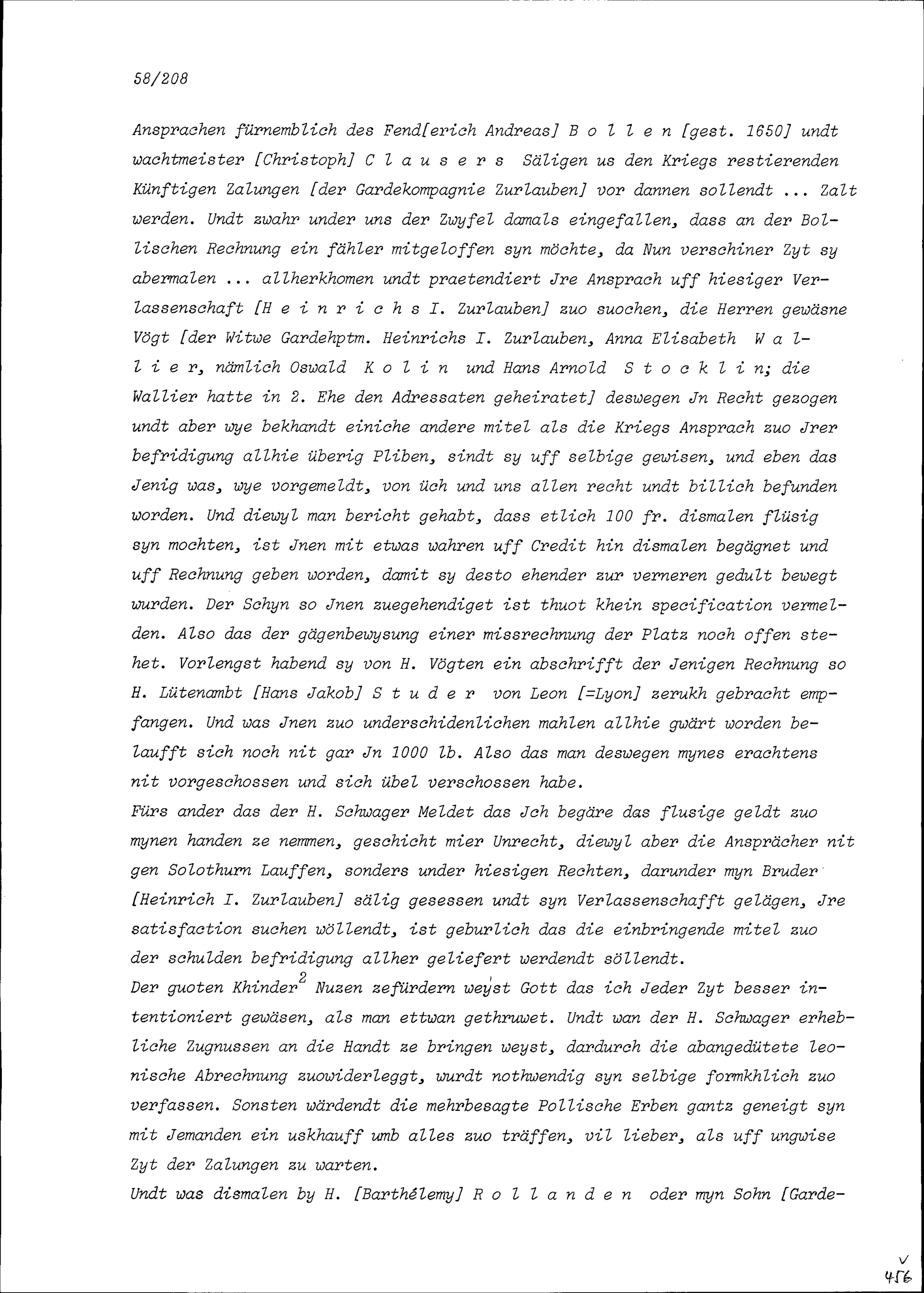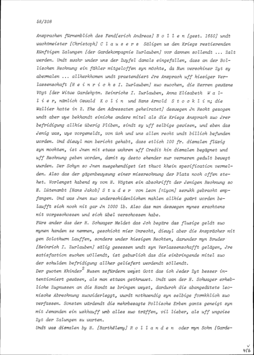 Schreiben von Beat II. Zurlauben, Nachlassverwalter, an Hans Wilhelm von Steinbrugg, Seckelmeister von Solothurn