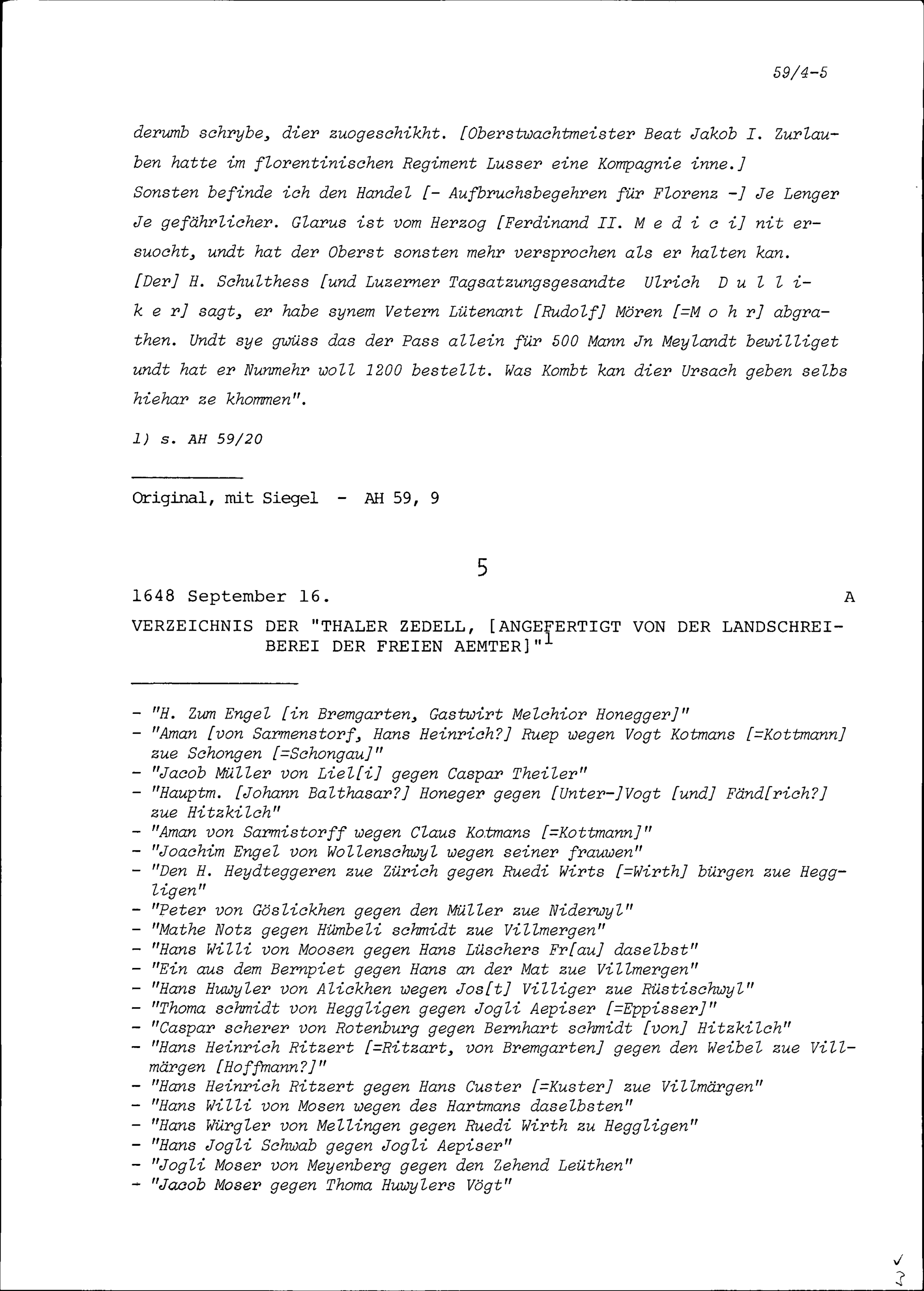 Talerzettelliste, erstellt von der Landschreiberei der Freien Ämter